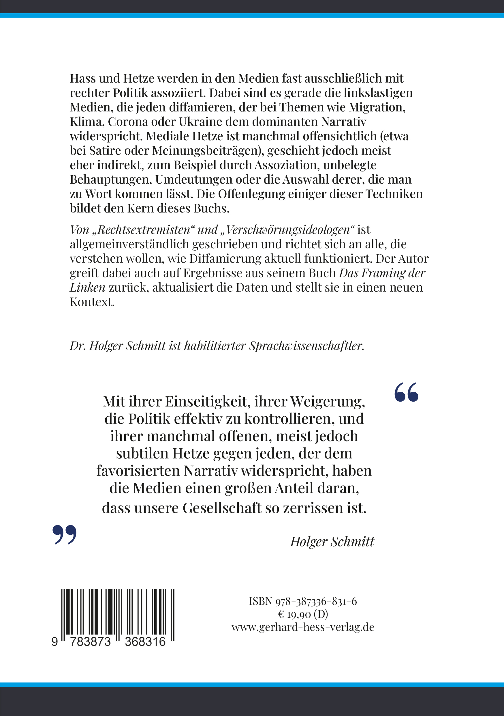 Hass und Hetze werden in den Medien fast ausschließlich mit rechter Politik assoziiert. Dabei sind es gerade die linkslastigen Medien, die jeden diffamieren, der bei Themen wie Migration, Klima, Corona oder Ukraine dem dominanten Narrativ widerspricht. Mediale Hetze ist manchmal offensichtlich (etwa bei Satire oder Meinungsbeiträgen), geschieht jedoch meist eher indirekt, zum Beispiel durch Assoziation, unbelegte Behauptungen, Umdeutungen oder die Auswahl derer, die man zu Wort kommen lässt. Die Offenlegung einiger dieser Techniken bildet den Kern dieses Buchs. Von "Rechtsextremisten" und "Verschwörungsideologen" ist allgemeinverständlich geschrieben und richtet sich an alle, die verstehen wollen, wie Diffamierung aktuell funktioniert. Der Autor greift dabei auch auf Ergebnisse aus seinem Buch Das Framing der Linken zurück, aktualisiert die Daten und stellt sie in einen neuen Kontext.