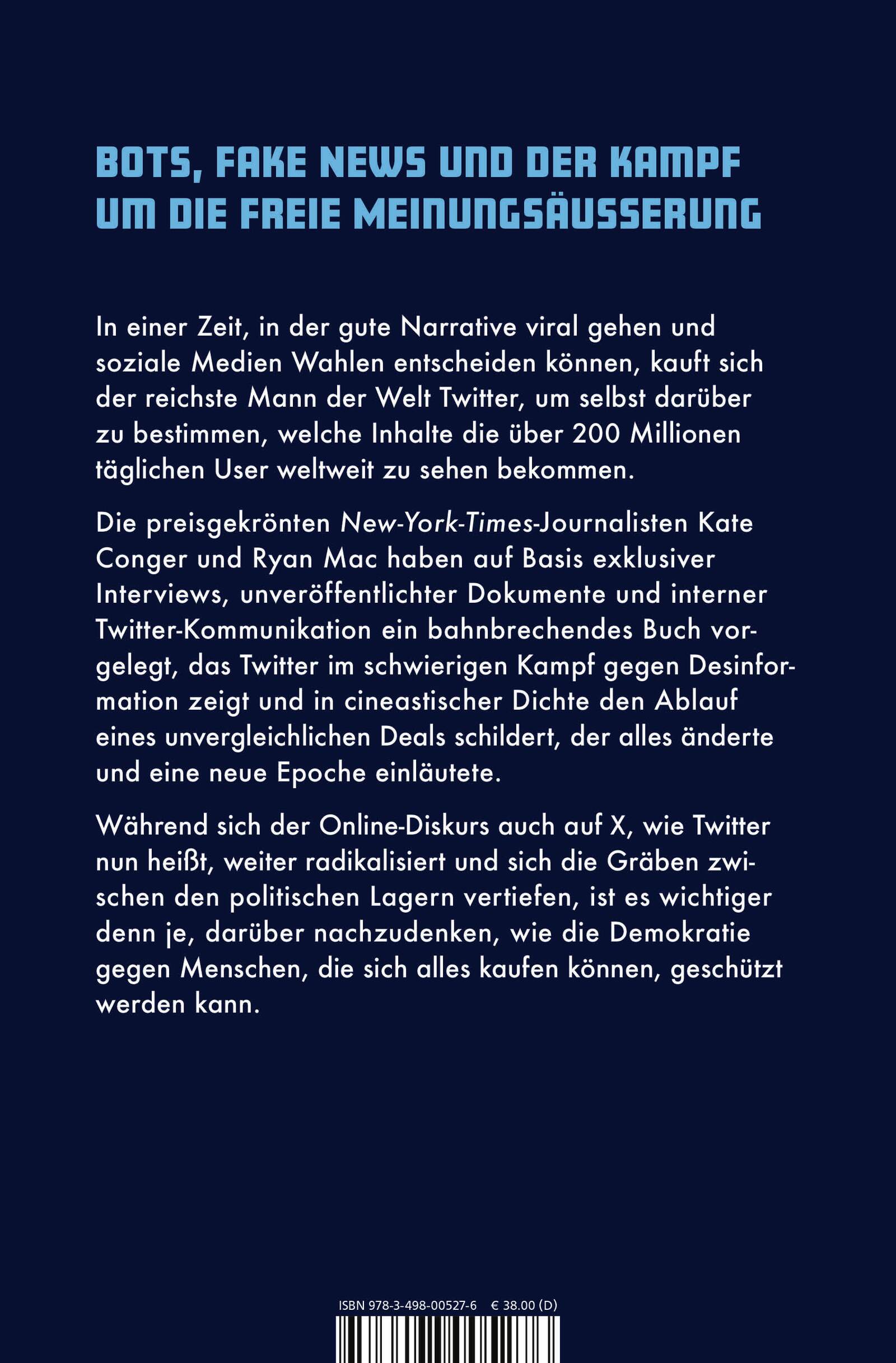 Basierend auf Hunderten von Interviews mit (ehemaligen) Mitarbeitenden von Twitter, mit großem Insiderwissen und cineastischer Dramaturgie schildern Kate Conger und Ryan Mac die Details der umstrittenen Übernahme, die Massenentlassungen, die Auflösung des Content-Moderation-Teams sowie die unglückliche Umbenennung in X und Musks umstrittenes Geschäftsmodell.