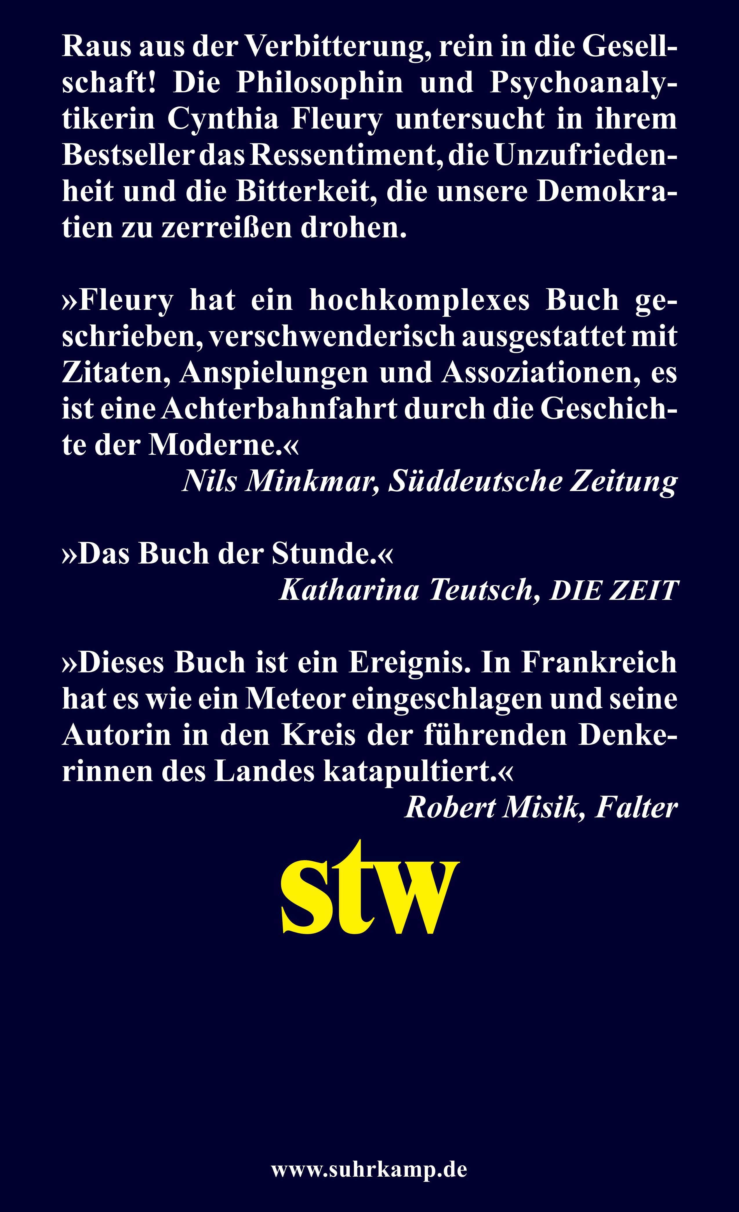 »Fleury ist als Philosophin und Psychoanalytikerin zurückhaltend damit, konkrete Bezüge zur politischen und gesellschaftlichen Realität explizit herzustellen. Der Begriff des Ressentiments ist jedoch so offensichtlich ein Generalschlüssel zu vielen Phänomenen der Gegenwart, dass bei der Lektüre sofort einige Schlösser aufspringen.«