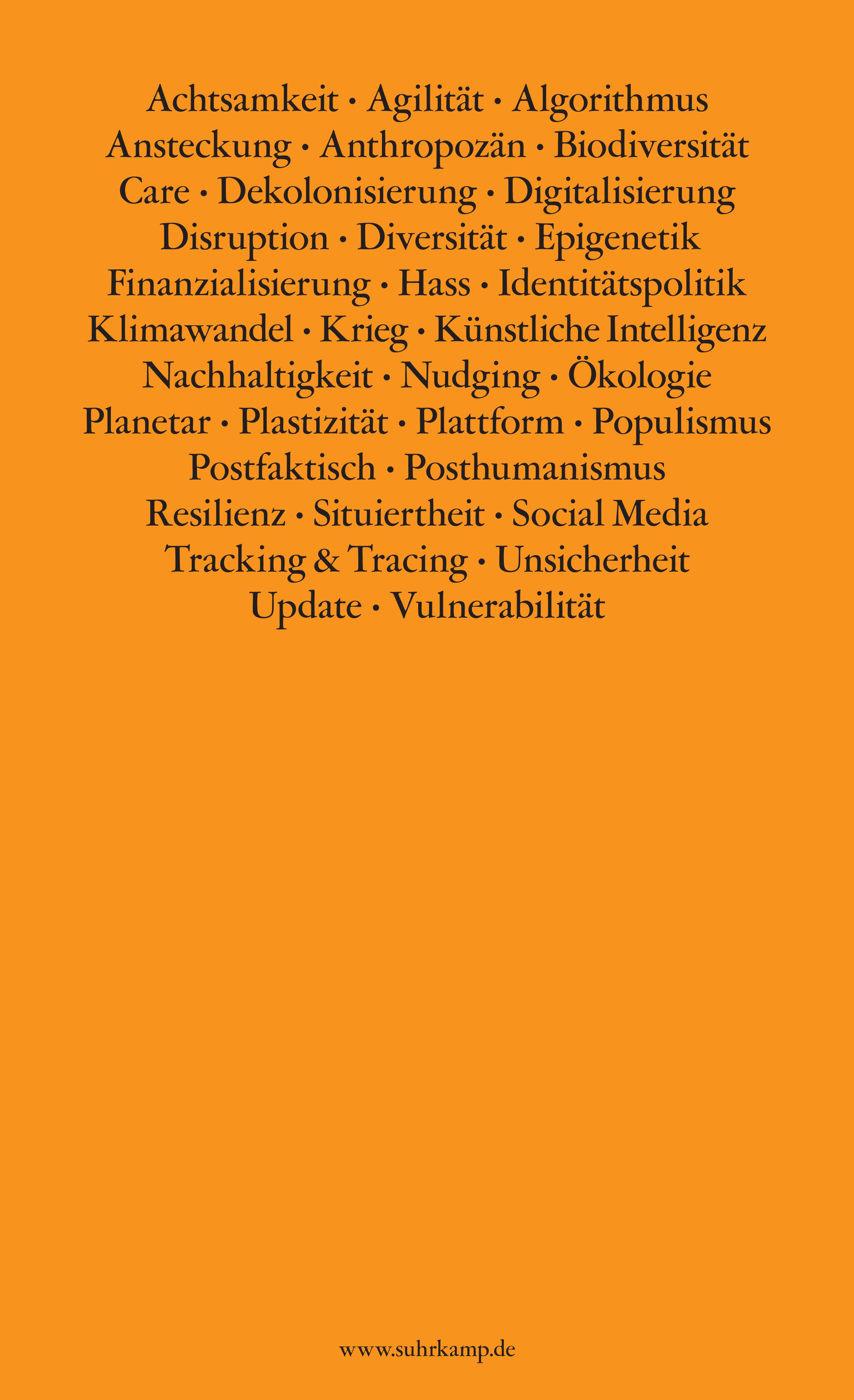 Zwanzig Jahre später, nach der Weltfinanzkrise und im Zeichen des Aufstiegs rechtspopulistischer Parteien sowie der inzwischen deutlich spürbaren Auswirkungen des Klimawandels, ist es Zeit für ein Update. Die Zeitgenoss:innen von heute erkennen sich in neuen Leitbegriffen wieder: »Disruption« tritt an die Stelle von »Normalität«, »das Planetare« löst »Globalisierung« ab, »Resilienz« ersetzt »Prävention«. Andere Begriffe wie »Dekolonisierung« oder »postfaktisch« haben keine Entsprechung im Vorläuferband. Die für die 2.0-Version des Glossars verfassten Beiträge sind Sonden zur Ermittlung des Selbstverständnisses unserer Gegenwart.