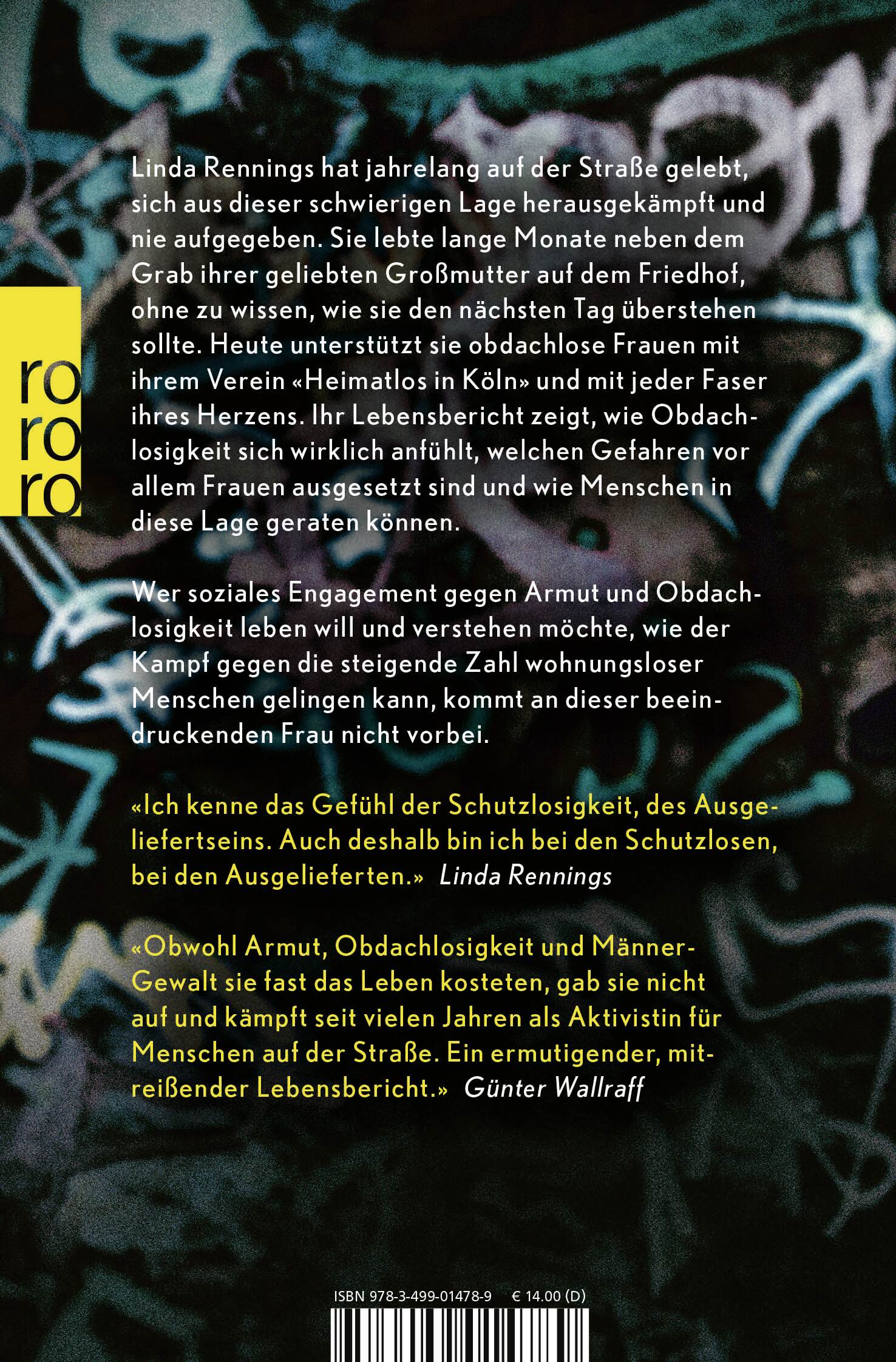 Linda Rennings, selbst einst obdachlos, kämpft heute für Frauen auf der Straße. Mit ihrem Verein «Heimatlos in Köln» weit über die Stadtgrenzen hinaus bekannt, bietet sie konkrete Unterstützung im harten Alltag. Die 60-Jährige spricht als ehemalige Leidensgenossin zu den Frauen, ihre Lebensgeschichte erzählt sie in «Rebellin der Straße» mitreißend und augenöffnend. Ihr schonungsloser Bericht steht exemplarisch für die Erlebnisse vieler Frauen, die auf der Straße besonderen Gefahren ausgesetzt sind. Wer soziales Engagement leben will und den täglichen Kampf der steigenden Zahl obdachloser Menschen wirklich verstehen möchte, kommt an Linda Rennings nicht vorbei.