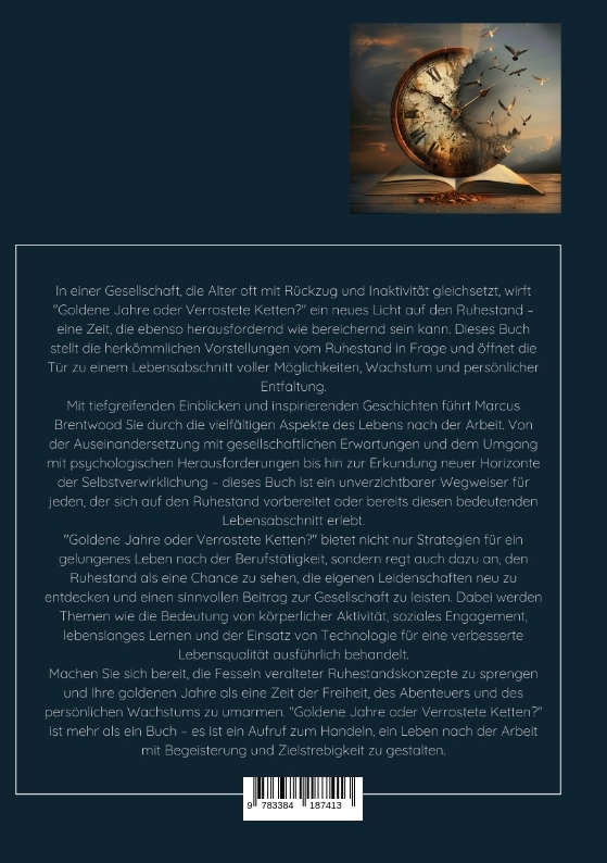 In einer Gesellschaft, die Alter oft mit Rückzug und Inaktivität gleichsetzt, wirft "Goldene Jahre oder Verrostete Ketten?" ein neues Licht auf den Ruhestand - eine Zeit, die ebenso herausfordernd wie bereichernd sein kann. Dieses Buch stellt die herkömmlichen Vorstellungen vom Ruhestand in Frage und öffnet die Tür zu einem Lebensabschnitt voller Möglichkeiten, Wachstum und persönlicher Entfaltung.Mit tiefgreifenden Einblicken und inspirierenden Geschichten führt Marcus Brentwood Sie durch die vielfältigen Aspekte des Lebens nach der Arbeit. Von der Auseinandersetzung mit gesellschaftlichen Erwartungen und dem Umgang mit psychologischen Herausforderungen bis hin zur Erkundung neuer Horizonte der Selbstverwirklichung - dieses Buch ist ein unverzichtbarer Wegweiser für jeden, der sich auf den Ruhestand vorbereitet oder bereits diesen bedeutenden Lebensabschnitt erlebt."Goldene Jahre oder Verrostete Ketten?" bietet nicht nur Strategien für ein gelungenes Leben nach der Berufstätigkeit, sondern regt auch dazu an, den Ruhestand als eine Chance zu sehen, die eigenen Leidenschaften neu zu entdecken und einen sinnvollen Beitrag zur Gesellschaft zu leisten. Dabei werden Themen wie die Bedeutung von körperlicher Aktivität, soziales Engagement, lebenslanges Lernen und der Einsatz von Technologie für eine verbesserte Lebensqualität ausführlich behandelt.Machen Sie sich bereit, die Fesseln veralteter Ruhestandskonzepte zu sprengen und Ihre goldenen Jahre als eine Zeit der Freiheit, des Abenteuers und des persönlichen Wachstums zu umarmen. "Goldene Jahre oder Verrostete Ketten?" ist mehr als ein Buch - es ist ein Aufruf zum Handeln, ein Leben nach der Arbeit mit Begeisterung und Zielstrebigkeit zu gestalten.