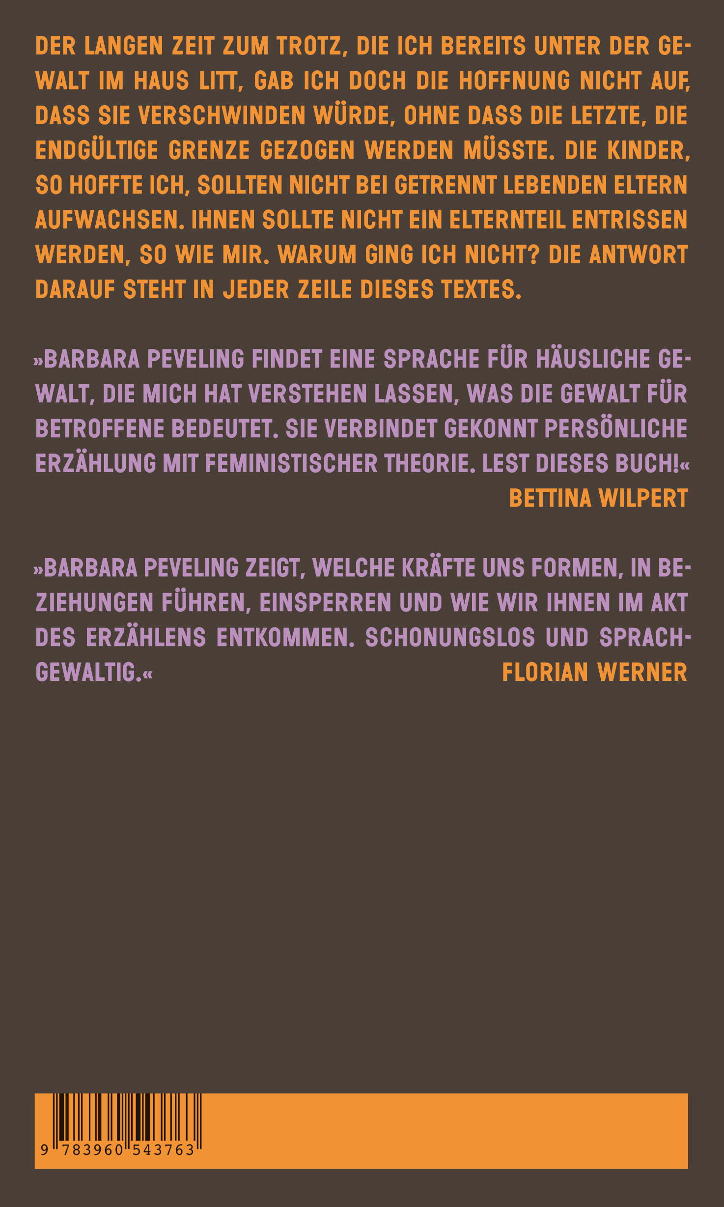 »Barbara Peveling findet eine Sprache für häusliche Gewalt, die mich hat verstehen lassen, was die Gewalt für Betroffene bedeutet. Sie verbindet gekonnt persönliche Erzählung mit feministischer Theorie. Lest dieses Buch!« Bettina Wilpert