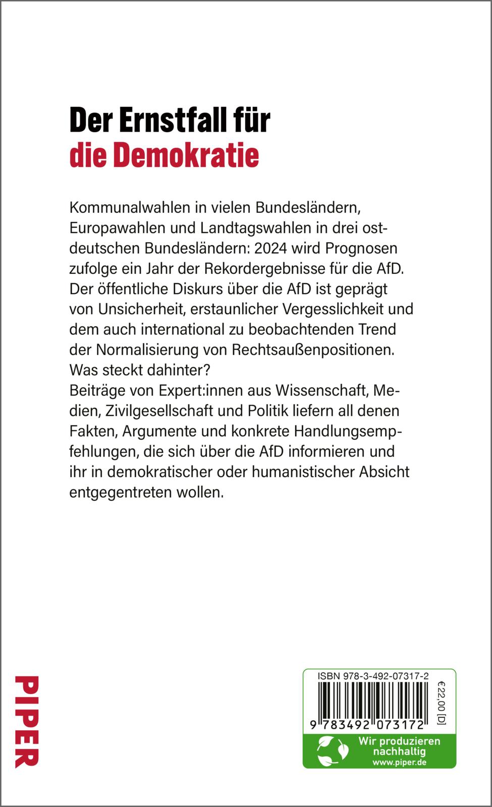 Dieses Buch versammelt Beiträge von Expert:innen aus Wissenschaft, Medien, Zivilgesellschaft und Politik und gibt all denen Fakten, Argumente und Handlungsempfehlungen an die Hand, die sich über die AfD informieren und ihr entgegentreten wollen.