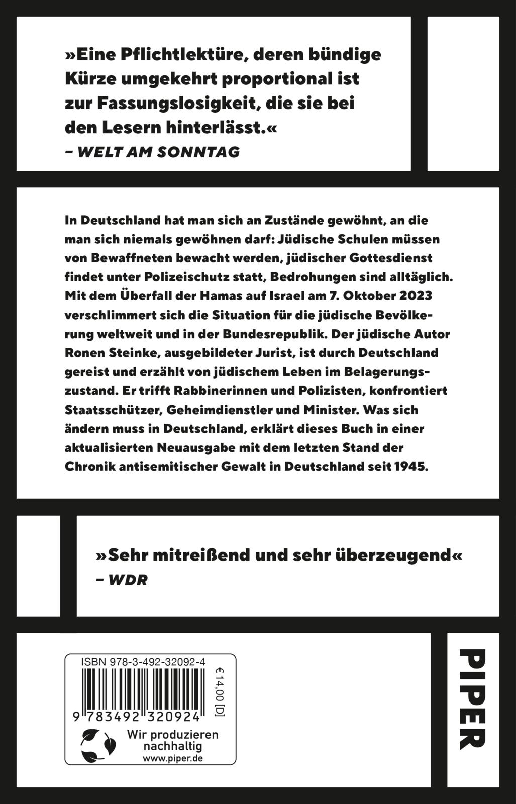 Der jüdische Autor Ronen Steinke, selbst Jurist, ist durch Deutschland gereist und erzählt von jüdischem Leben im Belagerungszustand. Er trifft Rabbinerinnen und Polizisten, konfrontiert Staatsschützer, Geheimdienstler und Minister mit dem Staatsversagen. Viel muss sich ändern in Deutschland. Was zu tun wäre, erklärt dieses Buch.