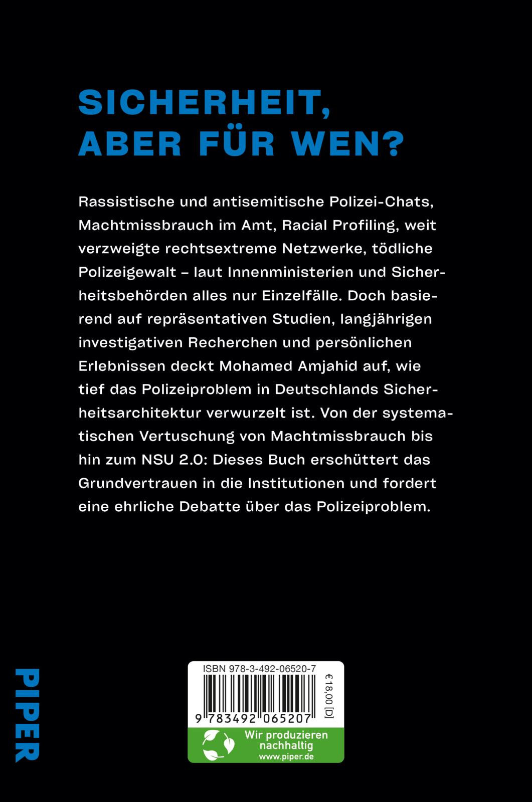 Rassistische und antisemitische Polizei-Chats, Machtmissbrauch im Amt, Racial Profiling, weit verzweigte rechtsextreme Netzwerke, tödliche Polizeigewalt - laut Innenministerien und Sicherheitsbehörden alles nur Einzelfälle. Doch basierend auf repräsentativen Studien, langjährigen investigativen Recherchen und persönlichen Erlebnissen deckt Mohamed Amjahid auf, wie tief das Polizeiproblem in Deutschlands Sicherheitsarchitektur verwurzelt ist. Von der systematischen Vertuschung von Machtmissbrauch bis hin zum NSU 2.0: Dieses Buch erschüttert das Grundvertrauen in die Institution Polizei und fordert eine ehrliche Debatte über das Polizeiproblem.