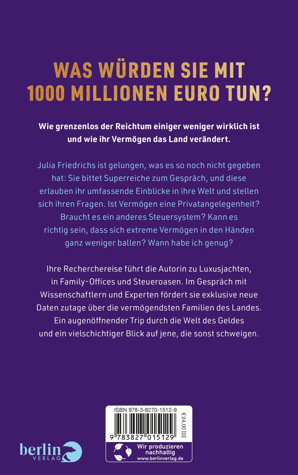 Julia Friedrichs ist gelungen, was es so noch nicht gegeben hat: Sie bittet Superreiche zum Gespräch, und diese erlauben ihr umfassende Einblicke in ihre Welt und stellen sich ihren Fragen. Ist Vermögen eine Privatangelegenheit? Braucht es ein anderes Steuersystem? Kann es richtig sein, dass sich extreme Vermögen in den Händen ganz weniger ballen? Wann habe ich genug?