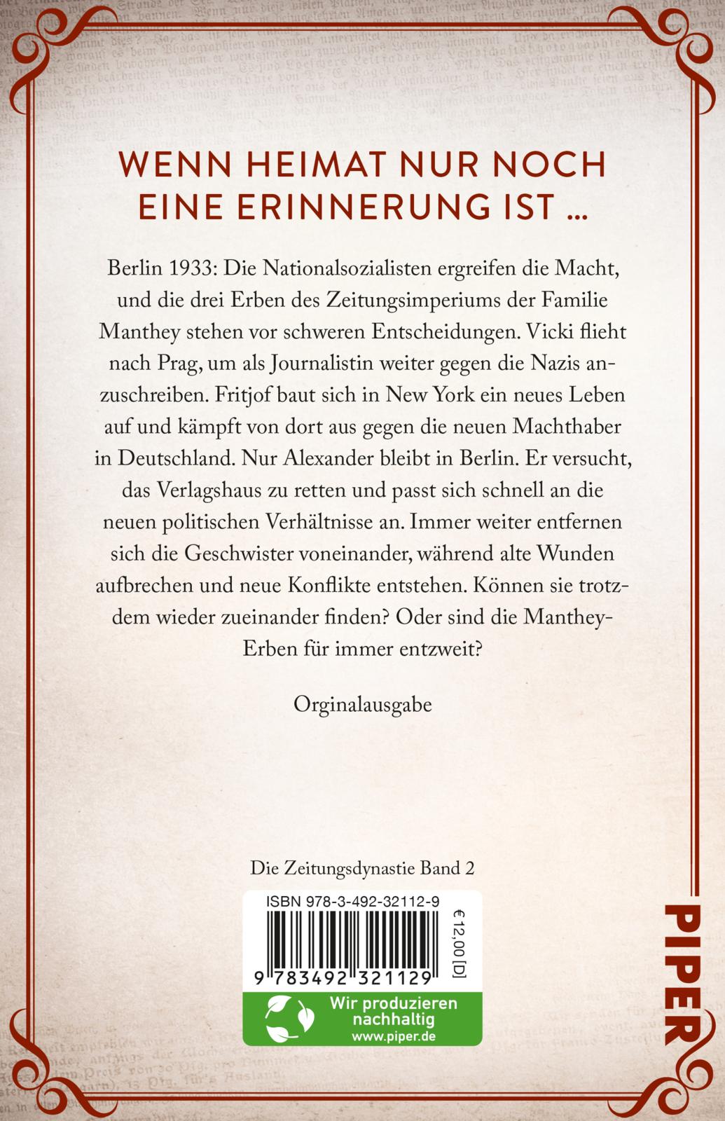 1933: Die drei Manthey-Erben finden sich in einer Welt im Umbruch wieder. Während Vicki als Reporterin im Prager Exil gegen die neuen Machthaber in Deutschland anschreibt, sucht Fritjof in New York nach Möglichkeiten, aus der Ferne gegen das Nazi-Regime zu wirken. Währenddessen steuert Alexander in Berlin das Zeitungsimperium geschickt durch die neuen Machtstrukturen. Zwischen Anpassung und Widerstand entfernen sich die Geschwister immer weiter voneinander, während die Welt um sie herum zusammenbricht.