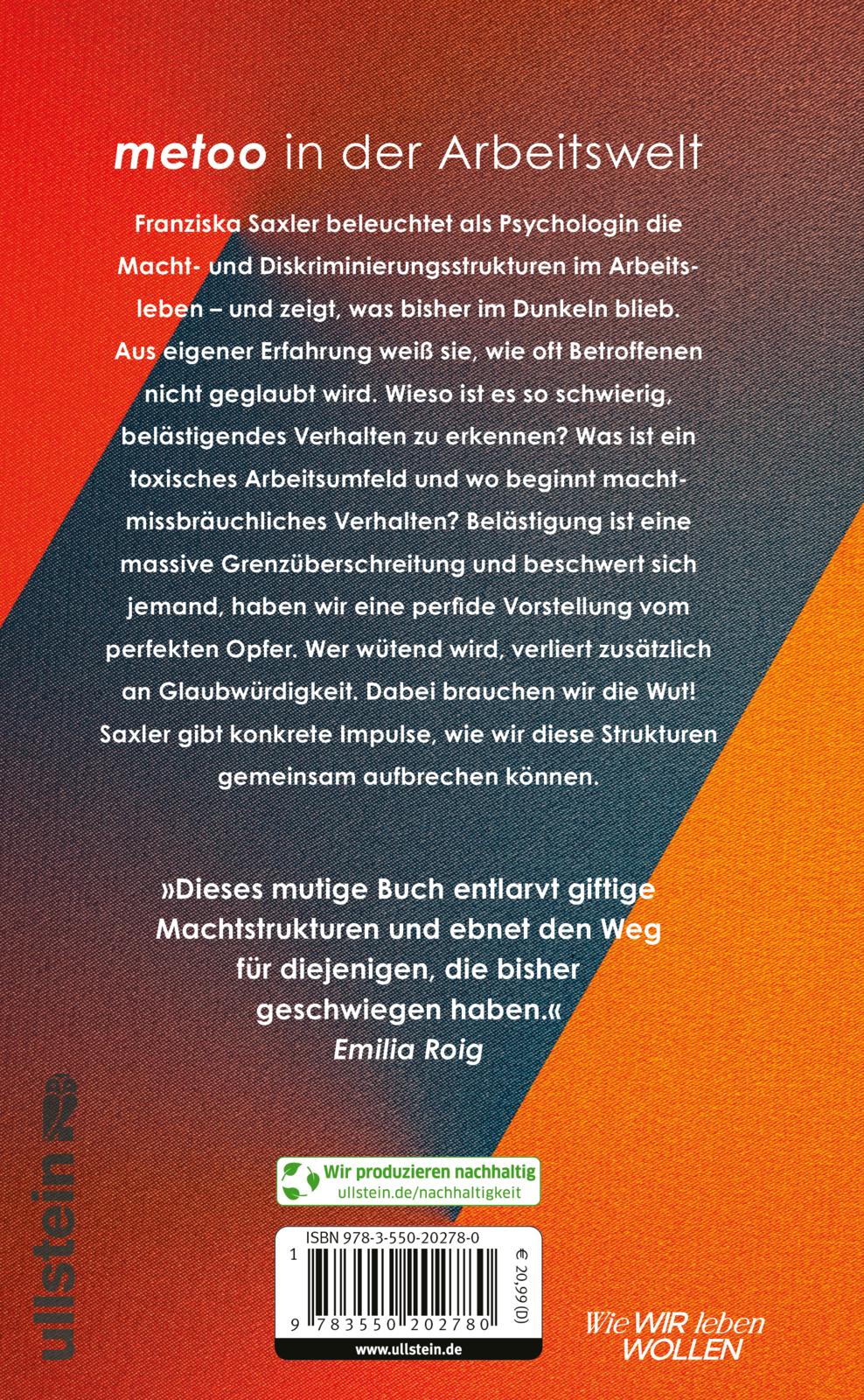 Franziska Saxler hat selbst Erfahrungen mit struktureller Gewalt gemacht: an der Universität als Promovierende in der Psychologie. Daraufhin hat sie mit anderen Betroffenen #metooscience gegründet und eine neue Doktorarbeit begonnen. Thema: sexuelle Belästigung am Arbeitsplatz. In ihrem Buch beleuchtet sie die Macht- und Diskriminierungsstrukturen im Arbeitsleben. Sie zeigt auf, was ein toxisches Arbeitsumfeld ausmacht, und ermöglicht Betroffenen, den Machtmissbrauch zu erkennen und erste Schritte zur Heilung zu unternehmen.