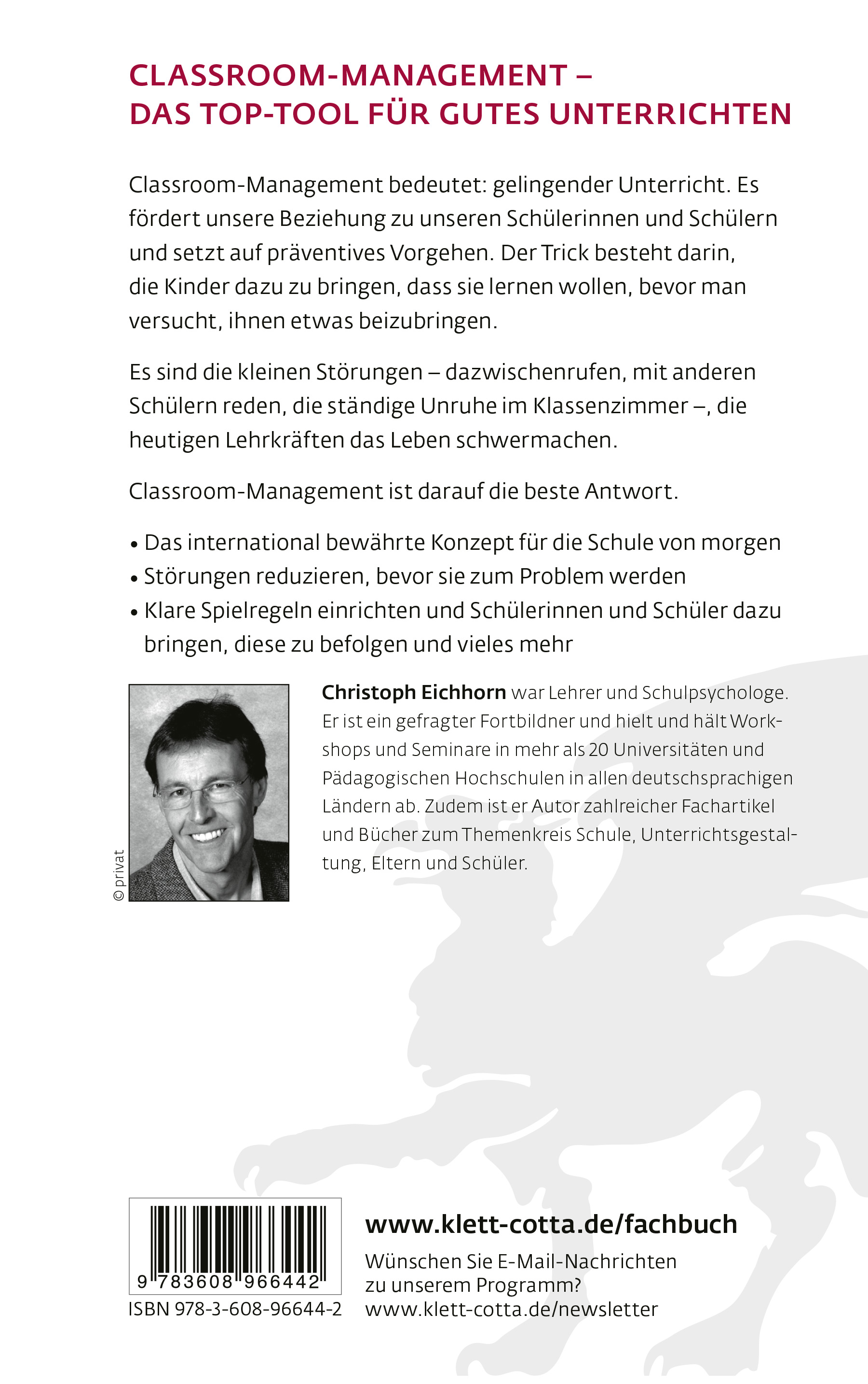 »Die Notwendigkeit eines adäquaten Classroom-Managements ist für Schüler, Lehrpersonen und Eltern sowie für andere Institutionen gegeben, die die Verpflichtung übernahmen, an der Erziehung und Bildung von Kindern, Schülern und Jugendlichen mitzuwirken. Deshalb ist der hier vorgelegte Band nicht nur für Lehrer, sondern auch für Eltern und Mitarbeiter in sozialen Institutionen von hoher Bedeutung. Aufgrund zahlreicher Besuche in US-Schulen erlaube ich mir zu sagen, dass Chr. Eichhorns Classroom-Management auch in Deutschland voll praktikabel ist: Classroom-Management bringt Eltern, Schüler und Lehrer "vorwärts", ermöglicht Lehrpersonen, Leistungen optimal zu erbringen, und Schülern, ihre Ressourcen zu entfalten und kompetent zu werden.«