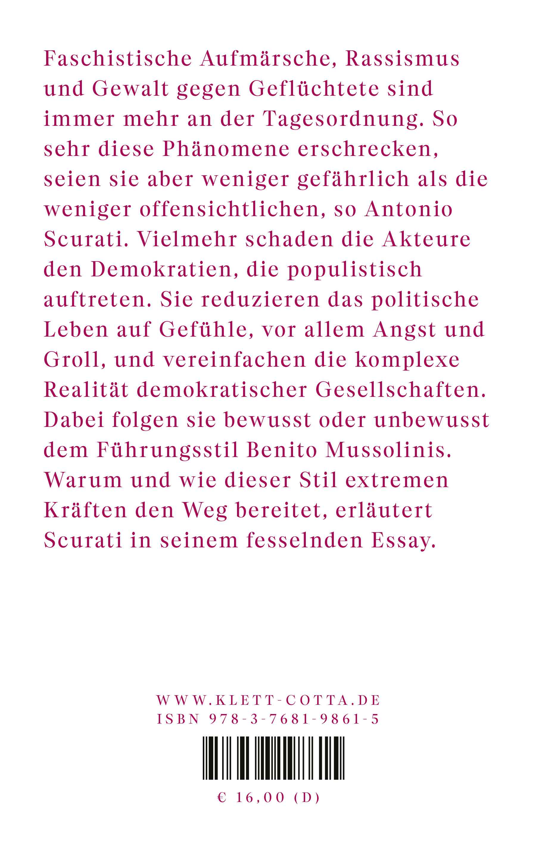 Faschistische Aufmärsche, Rassismus und Gewalt gegen Geflüchtete sind immer mehr an der Tagesordnung. So sehr diese Phänomene erschrecken, seien sie aber weniger gefährlich als die weniger offensichtlichen, so Antonio Scurati. Vielmehr schaden die Akteure den Demokratien, die populistisch auftreten und nicht in die Kategorien rechts oder links unterteilt werden können. Denn Sie reduzieren das politische Leben auf Gefühle, vor allem Angst und Groll, vereinfachen die komplexe Realität demokratischer Gesellschaften - und verzeichnen damit Erfolge. Dabei folgen sie bewusst oder unbewusst dem Führungsstil Benito Mussolinis. Warum sich dieser Stil in unserer Zeit einer solchen Vehemenz erfreut und wie er faschistischen, rechtsextremen und reaktionären Kräften den Weg bereitet, erläutert Scurati in seinem neuen Essay.