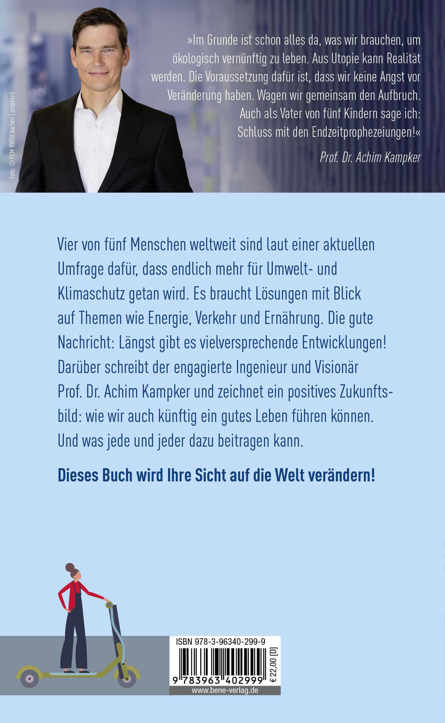 Der erfahrene Ingenieur beschreibt eine umsetzbare Vision für ein nachhaltiges Leben und ermutigt: »Für viele Probleme gelingt eine pragmatische Lösung durch die Kombination vorhandener Technologien mit einem regionalen Masterplan. Überall auf der Welt arbeiten Forscherinnen und Forscher daran, die schwierige Lage in den Griff zu bekommen. Sie versöhnen technischen Fortschritt mit Umweltschutz. Dabei geht es auch um die Sicherung von Deutschland als attraktiven Wirtschaftsstandort mit nachhaltiger Ausrichtung.