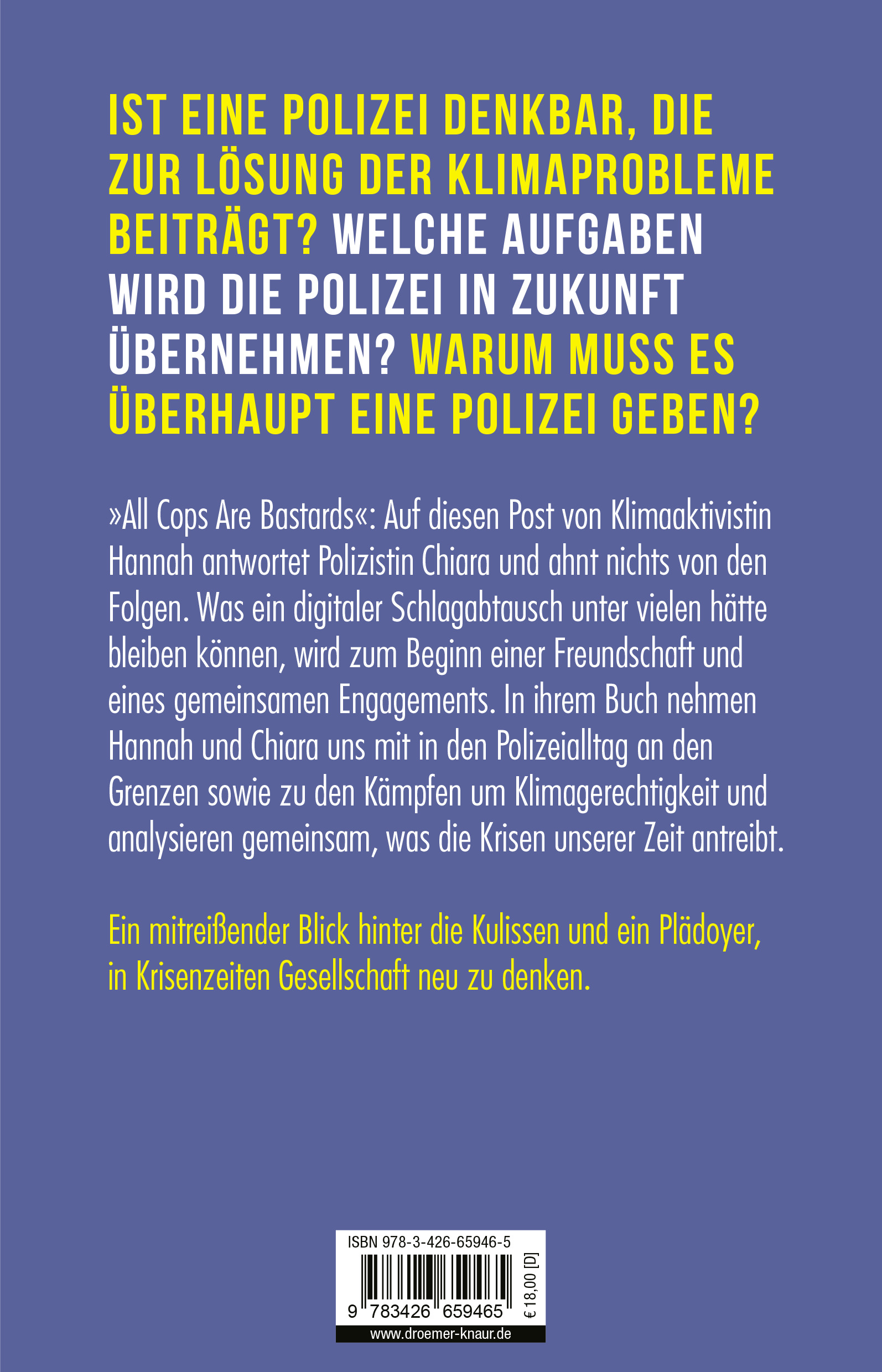 | Schlagworte | Aktivismus • Arbeitsweise der Polizei • Chiara und Hannah • Cop Culture • Demokratie • Erfahrungsbericht • Frauen bei der Polizei • Gesellschaft • Gewaltausübung durch Polizei • Gewaltmonopol • Innenleben der Polizei • Insiderbericht • Klimaaktivismus • Klimagerechtigkeit • Klimakrise • Klimawandel • korpsgeist • letzte Generation • Meinungsfreiheit • Neutralitätspflicht • Polizeialltag • Polizeigewalt • Polizeikritik • Polizeireform • Polizei und Gesellschaft • racial profiling • Rechte Chatgruppen • Reform der Polizei • Sachbuch Polizei • Staatsgewalt • Staatsmacht • Streitschrift • Zivilgesellschaft |