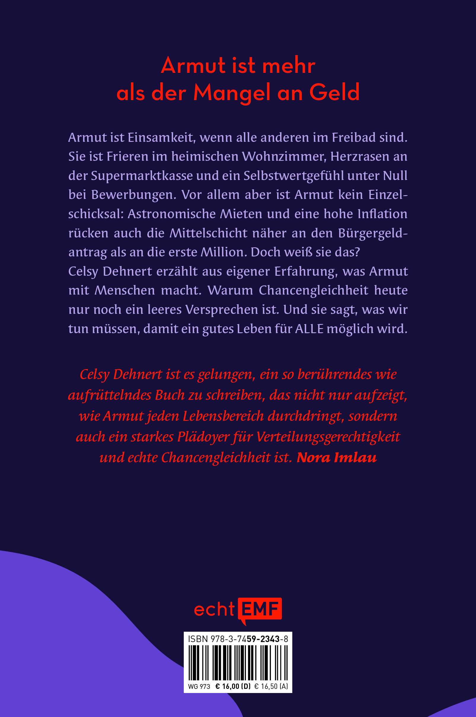 „Celsy Dehnert ist es gelungen, ein so berührendes wie aufrüttelndes Buch zu schreiben, das nicht nur aufzeigt, wie Armut jeden Lebensbereich durchdringt, sondern auch ein starkes Plädoyer für Verteilungsgerechtigkeit und echte Chancengleichheit ist.“ Nora Imlau