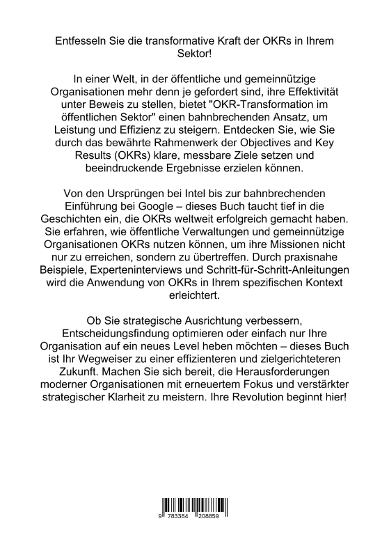 Entfesseln Sie die transformative Kraft der OKRs in Ihrem Sektor!In einer Welt, in der öffentliche und gemeinnützige Organisationen mehr denn je gefordert sind, ihre Effektivität unter Beweis zu stellen, bietet "OKR-Transformation im öffentlichen Sektor" einen bahnbrechenden Ansatz, um Leistung und Effizienz zu steigern. Entdecken Sie, wie Sie durch das bewährte Rahmenwerk der Objectives and Key Results (OKRs) klare, messbare Ziele setzen und beeindruckende Ergebnisse erzielen können.Von den Ursprüngen bei Intel bis zur bahnbrechenden Einführung bei Google - dieses Buch taucht tief in die Geschichten ein, die OKRs weltweit erfolgreich gemacht haben. Sie erfahren, wie öffentliche Verwaltungen und gemeinnützige Organisationen OKRs nutzen können, um ihre Missionen nicht nur zu erreichen, sondern zu übertreffen. Durch praxisnahe Beispiele, Experteninterviews und Schritt-für-Schritt-Anleitungen wird die Anwendung von OKRs in Ihrem spezifischen Kontext erleichtert.Ob Sie strategische Ausrichtung verbessern, Entscheidungsfindung optimieren oder einfach nur Ihre Organisation auf ein neues Level heben möchten - dieses Buch ist Ihr Wegweiser zu einer effizienteren und zielgerichteteren Zukunft. Machen Sie sich bereit, die Herausforderungen moderner Organisationen mit erneuertem Fokus und verstärkter strategischer Klarheit zu meistern. Ihre Revolution beginnt hier!