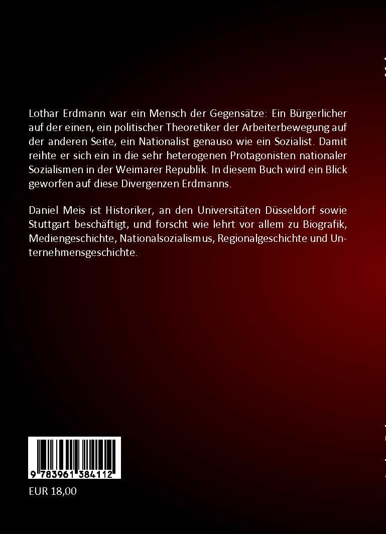 Lothar Erdmann war ein Mensch der Gegensätze: Ein Bürgerlicher auf der einen, ein politischer Theoretiker der Arbeiterbewegung auf der anderen Seite, ein Nationalist genauso wie ein Sozialist. Damit reihte er sich ein in die sehr heterogenen Protagonisten nationaler Sozialismen in der Weimarer Republik. In diesem Buch wird ein Blick geworfen auf diese Divergenzen Erdmanns.