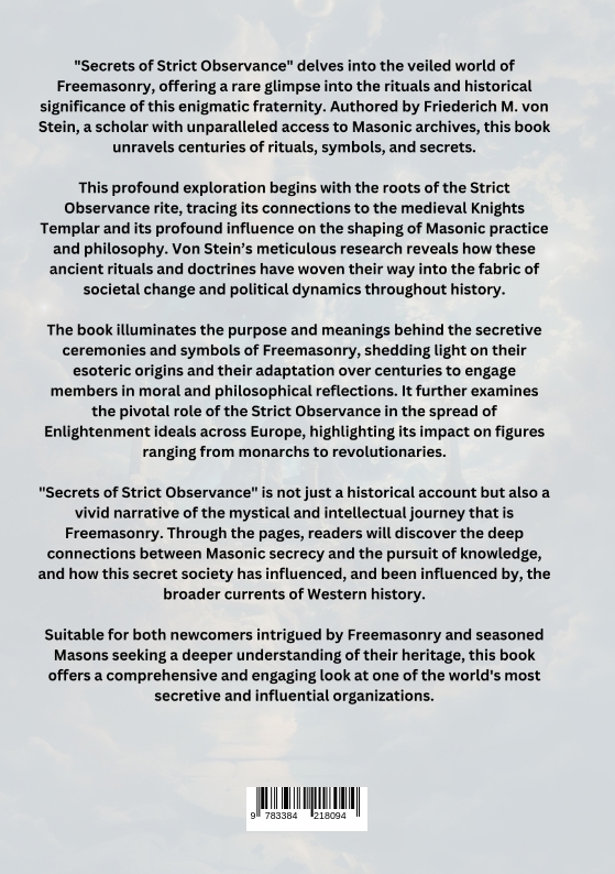 "Secrets of Strict Observance" delves into the veiled world of Freemasonry, offering a rare glimpse into the rituals and historical significance of this enigmatic fraternity. Authored by Friederich M. von Stein, a scholar with unparalleled access to Masonic archives, this book unravels centuries of rituals, symbols, and secrets.This profound exploration begins with the roots of the Strict Observance rite, tracing its connections to the medieval Knights Templar and its profound influence on the shaping of Masonic practice and philosophy. Von Stein's meticulous research reveals how these ancient rituals and doctrines have woven their way into the fabric of societal change and political dynamics throughout history.The book illuminates the purpose and meanings behind the secretive ceremonies and symbols of Freemasonry, shedding light on their esoteric origins and their adaptation over centuries to engage members in moral and philosophical reflections. It further examines the pivotal role of the Strict Observance in the spread of Enlightenment ideals across Europe, highlighting its impact on figures ranging from monarchs to revolutionaries."Secrets of Strict Observance" is not just a historical account but also a vivid narrative of the mystical and intellectual journey that is Freemasonry. Through the pages, readers will discover the deep connections between Masonic secrecy and the pursuit of knowledge, and how this secret society has influenced, and been influenced by, the broader currents of Western history.Suitable for both newcomers intrigued by Freemasonry and seasoned Masons seeking a deeper understanding of their heritage, this book offers a comprehensive and engaging look at one of the world's most secretive and influential organizations.