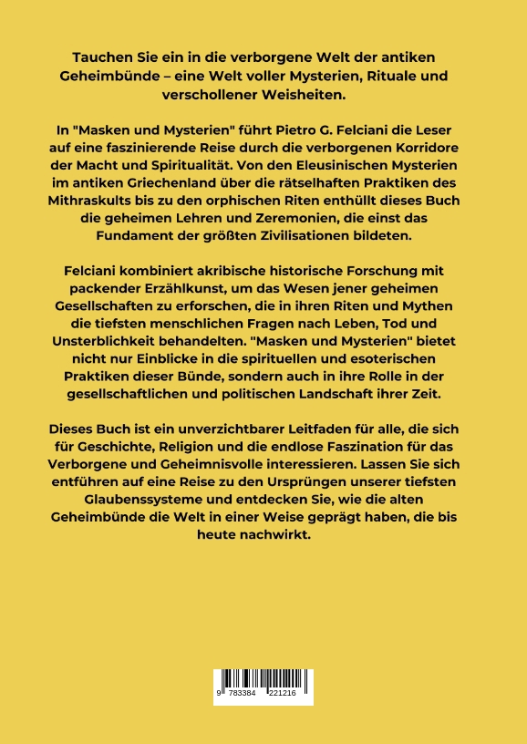 Tauchen Sie ein in die verborgene Welt der antiken Geheimbünde - eine Welt voller Mysterien, Rituale und verschollener Weisheiten.In "Masken und Mysterien" führt Pietro G. Felciani die Leser auf eine faszinierende Reise durch die verborgenen Korridore der Macht und Spiritualität. Von den Eleusinischen Mysterien im antiken Griechenland über die rätselhaften Praktiken des Mithraskults bis zu den orphischen Riten enthüllt dieses Buch die geheimen Lehren und Zeremonien, die einst das Fundament der größten Zivilisationen bildeten.Felciani kombiniert akribische historische Forschung mit packender Erzählkunst, um das Wesen jener geheimen Gesellschaften zu erforschen, die in ihren Riten und Mythen die tiefsten menschlichen Fragen nach Leben, Tod und Unsterblichkeit behandelten. "Masken und Mysterien" bietet nicht nur Einblicke in die spirituellen und esoterischen Praktiken dieser Bünde, sondern auch in ihre Rolle in der gesellschaftlichen und politischen Landschaft ihrer Zeit.Dieses Buch ist ein unverzichtbarer Leitfaden für alle, die sich für Geschichte, Religion und die endlose Faszination für das Verborgene und Geheimnisvolle interessieren. Lassen Sie sich entführen auf eine Reise zu den Ursprüngen unserer tiefsten Glaubenssysteme und entdecken Sie, wie die alten Geheimbünde die Welt in einer Weise geprägt haben, die bis heute nachwirkt.