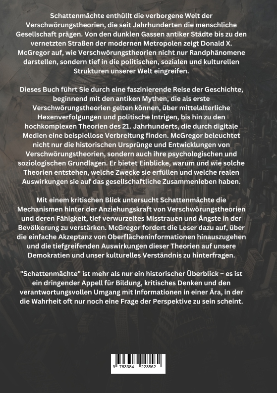 Schattenmächte enthüllt die verborgene Welt der Verschwörungstheorien, die seit Jahrhunderten die menschliche Gesellschaft prägen. Von den dunklen Gassen antiker Städte bis zu den vernetzten Straßen der modernen Metropolen zeigt Donald X. McGregor auf, wie Verschwörungstheorien nicht nur Randphänomene darstellen, sondern tief in die politischen, sozialen und kulturellen Strukturen unserer Welt eingreifen.Dieses Buch führt Sie durch eine faszinierende Reise der Geschichte, beginnend mit den antiken Mythen, die als erste Verschwörungstheorien gelten können, über mittelalterliche Hexenverfolgungen und politische Intrigen, bis hin zu den hochkomplexen Theorien des 21. Jahrhunderts, die durch digitale Medien eine beispiellose Verbreitung finden. McGregor beleuchtet nicht nur die historischen Ursprünge und Entwicklungen von Verschwörungstheorien, sondern auch ihre psychologischen und soziologischen Grundlagen. Er bietet Einblicke, warum und wie solche Theorien entstehen, welche Zwecke sie erfüllen und welche realen Auswirkungen sie auf das gesellschaftliche Zusammenleben haben.Mit einem kritischen Blick untersucht Schattenmächte die Mechanismen hinter der Anziehungskraft von Verschwörungstheorien und deren Fähigkeit, tief verwurzeltes Misstrauen und Ängste in der Bevölkerung zu verstärken. McGregor fordert die Leser dazu auf, über die einfache Akzeptanz von Oberflächeninformationen hinauszugehen und die tiefgreifenden Auswirkungen dieser Theorien auf unsere Demokratien und unser kulturelles Verständnis zu hinterfragen."Schattenmächte" ist mehr als nur ein historischer Überblick - es ist ein dringender Appell für Bildung, kritisches Denken und den verantwortungsvollen Umgang mit Informationen in einer Ära, in der die Wahrheit oft nur noch eine Frage der Perspektive zu sein scheint.