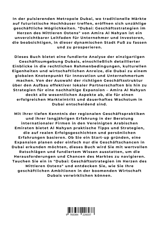 In der pulsierenden Metropole Dubai, wo traditionelle Märkte auf futuristische Hochhäuser treffen, eröffnen sich unzählige geschäftliche Möglichkeiten. "Dubai: Geschäftsstrategien im Herzen des Mittleren Ostens" von Amira Al Nahyan ist ein unverzichtbarer Leitfaden für Unternehmer und Investoren, die beabsichtigen, in dieser dynamischen Stadt Fuß zu fassen und zu prosperieren.Dieses Buch bietet eine fundierte Analyse der einzigartigen Geschäftsumgebung Dubais, einschließlich detaillierter Einblicke in die rechtlichen Rahmenbedingungen, kulturellen Eigenheiten und wirtschaftlichen Anreize, die Dubai zu einem globalen Knotenpunkt für Innovation und Unternehmertum machen. Von der Auswahl der richtigen Geschäftsstruktur über den Aufbau effektiver lokaler Partnerschaften bis hin zu Strategien für eine nachhaltige Expansion - Amira Al Nahyan deckt alle wesentlichen Aspekte ab, die für einen erfolgreichen Markteintritt und dauerhaftes Wachstum in Dubai entscheidend sind.Mit ihrer tiefen Kenntnis der regionalen Geschäftspraktiken und ihrer langjährigen Erfahrung in der Beratung internationaler Firmen in den Vereinigten Arabischen Emiraten bietet Al Nahyan praktische Tipps und Strategien, die auf realen Erfolgsgeschichten und persönlichen Erfahrungen basieren. Ob Sie ein Start-up gründen, eine Expansion planen oder einfach nur die Geschäftschancen in Dubai erkunden möchten, dieses Buch wird Sie mit wertvollen Ratschlägen und fundiertem Wissen ausstatten, um die Herausforderungen und Chancen des Marktes zu navigieren.Tauchen Sie ein in "Dubai: Geschäftsstrategien im Herzen des Mittleren Ostens" und entdecken Sie, wie Sie Ihre geschäftlichen Ambitionen in der boomenden Wirtschaft Dubais verwirklichen können.