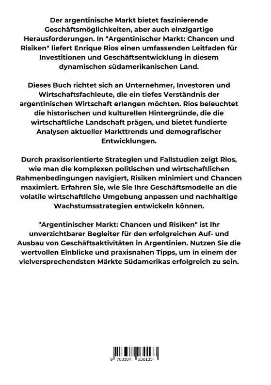 Der argentinische Markt bietet faszinierende Geschäftsmöglichkeiten, aber auch einzigartige Herausforderungen. In "Argentinischer Markt: Chancen und Risiken" liefert Enrique Rios einen umfassenden Leitfaden für Investitionen und Geschäftsentwicklung in diesem dynamischen südamerikanischen Land.Dieses Buch richtet sich an Unternehmer, Investoren und Wirtschaftsfachleute, die ein tiefes Verständnis der argentinischen Wirtschaft erlangen möchten. Rios beleuchtet die historischen und kulturellen Hintergründe, die die wirtschaftliche Landschaft prägen, und bietet fundierte Analysen aktueller Markttrends und demografischer Entwicklungen.Durch praxisorientierte Strategien und Fallstudien zeigt Rios, wie man die komplexen politischen und wirtschaftlichen Rahmenbedingungen navigiert, Risiken minimiert und Chancen maximiert. Erfahren Sie, wie Sie Ihre Geschäftsmodelle an die volatile wirtschaftliche Umgebung anpassen und nachhaltige Wachstumsstrategien entwickeln können."Argentinischer Markt: Chancen und Risiken" ist Ihr unverzichtbarer Begleiter für den erfolgreichen Auf- und Ausbau von Geschäftsaktivitäten in Argentinien. Nutzen Sie die wertvollen Einblicke und praxisnahen Tipps, um in einem der vielversprechendsten Märkte Südamerikas erfolgreich zu sein.
