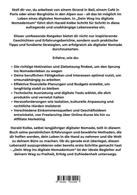 Stell dir vor, du arbeitest von einem Strand in Bali, einem Café in Paris oder einer Berghütte in den Alpen aus - all das ist möglich im Leben eines digitalen Nomaden. In "Dein Weg ins digitale Nomadentum" führt dich Harald Kolbe Schritt für Schritt in diese aufregende und unabhängige Lebensweise ein.Dieser umfassende Ratgeber bietet dir nicht nur inspirierende Geschichten und Erfahrungsberichte, sondern auch praktische Tipps und fundierte Strategien, um erfolgreich als digitaler Nomade durchzustarten.Erfahre, wie du:* Die richtige Motivation und Zielsetzung findest, um den Sprung ins Nomadenleben zu wagen* Deine beruflichen Fähigkeiten und Interessen optimal nutzt, um ortsunabhängig zu arbeiten* Effektive finanzielle Planungen und Budgets erstellst, um langfristig stabil zu bleiben* Technische Ausrüstung und digitale Tools wählst, die dich produktiv und vernetzt halten* Herausforderungen wie Isolation, kulturelle Anpassung und rechtliche Hürden meisterst* Verschiedene Einkommensquellen und Geschäftsideen entwickelst, von Freelancing über Online-Kurse bis hin zu Affiliate MarketingHarald Kolbe, selbst langjähriger digitaler Nomade, teilt in diesem Buch seine persönlichen Erfahrungen und bewährte Methoden, die dir helfen werden, dein Leben in die Hand zu nehmen und die Welt zu deinem Büro zu machen. Ob du gerade erst überlegst, diesen Lebensstil auszuprobieren oder bereits erste Schritte gemacht hast - "Dein Weg ins digitale Nomadentum" ist der ideale Begleiter auf deinem Weg zu Freiheit, Erfolg und Zufriedenheit unterwegs.