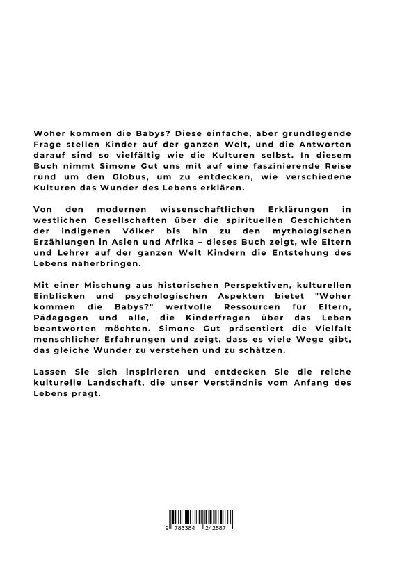 Woher kommen die Babys?Antworten zu Kinderfragen zur Entstehung des Lebens in verschiedenen KulturenVon Simone GutWoher kommen die Babys? Diese einfache, aber grundlegende Frage stellen Kinder auf der ganzen Welt, und die Antworten darauf sind so vielfältig wie die Kulturen selbst. In diesem Buch nimmt Simone Gut uns mit auf eine faszinierende Reise rund um den Globus, um zu entdecken, wie verschiedene Kulturen das Wunder des Lebens erklären.Von den modernen wissenschaftlichen Erklärungen in westlichen Gesellschaften über die spirituellen Geschichten der indigenen Völker bis hin zu den mythologischen Erzählungen in Asien und Afrika - dieses Buch zeigt, wie Eltern und Lehrer auf der ganzen Welt Kindern die Entstehung des Lebens näherbringen.Mit einer Mischung aus historischen Perspektiven, kulturellen Einblicken und psychologischen Aspekten bietet "Woher kommen die Babys?" wertvolle Ressourcen für Eltern, Pädagogen und alle, die Kinderfragen über das Leben beantworten möchten. Simone Gut präsentiert die Vielfalt menschlicher Erfahrungen und zeigt, dass es viele Wege gibt, das gleiche Wunder zu verstehen und zu schätzen.Lassen Sie sich inspirieren und entdecken Sie die reiche kulturelle Landschaft, die unser Verständnis vom Anfang des Lebens prägt.