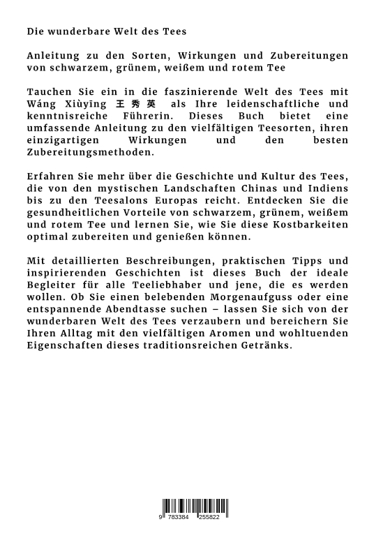 Wáng Xiùyīng 王秀英 ist eine renommierte Teeexpertin mit jahrelanger Erfahrung in der Teekultur und -tradition. Ihre Leidenschaft und ihr umfangreiches Wissen machen dieses Buch zu einer unverzichtbaren Ressource für jeden Teegenießer. Sie ist Autorin zahlreicher Werke in ihrer Heimat / Muttersprache
