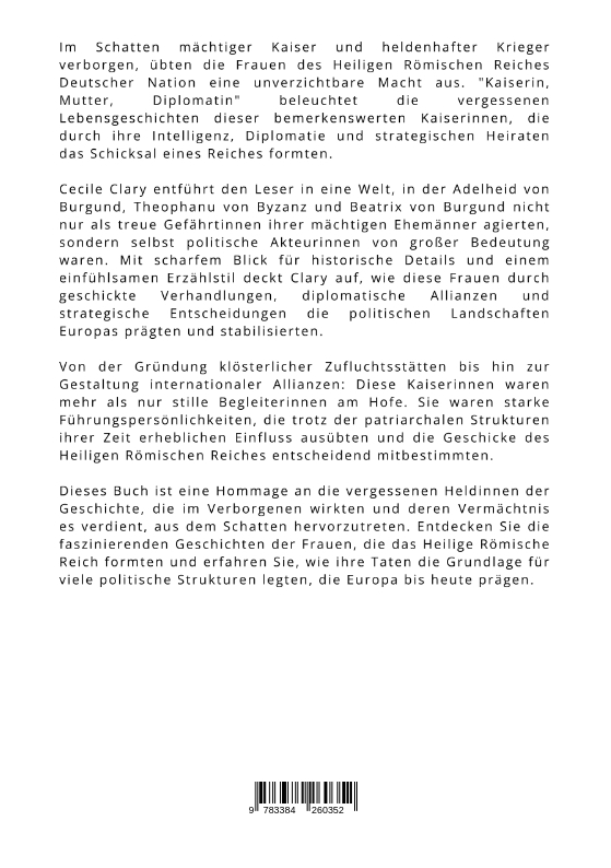 Im Schatten mächtiger Kaiser und heldenhafter Krieger verborgen, übten die Frauen des Heiligen Römischen Reiches Deutscher Nation eine unverzichtbare Macht aus. "Kaiserin, Mutter, Diplomatin" beleuchtet die vergessenen Lebensgeschichten dieser bemerkenswerten Kaiserinnen, die durch ihre Intelligenz, Diplomatie und strategischen Heiraten das Schicksal eines Reiches formten.Cecile Clary entführt den Leser in eine Welt, in der Adelheid von Burgund, Theophanu von Byzanz und Beatrix von Burgund nicht nur als treue Gefährtinnen ihrer mächtigen Ehemänner agierten, sondern selbst politische Akteurinnen von großer Bedeutung waren. Mit scharfem Blick für historische Details und einem einfühlsamen Erzählstil deckt Clary auf, wie diese Frauen durch geschickte Verhandlungen, diplomatische Allianzen und strategische Entscheidungen die politischen Landschaften Europas prägten und stabilisierten.Von der Gründung klösterlicher Zufluchtsstätten bis hin zur Gestaltung internationaler Allianzen: Diese Kaiserinnen waren mehr als nur stille Begleiterinnen am Hofe. Sie waren starke Führungspersönlichkeiten, die trotz der patriarchalen Strukturen ihrer Zeit erheblichen Einfluss ausübten und die Geschicke des Heiligen Römischen Reiches entscheidend mitbestimmten.Dieses Buch ist eine Hommage an die vergessenen Heldinnen der Geschichte, die im Verborgenen wirkten und deren Vermächtnis es verdient, aus dem Schatten hervorzutreten. Entdecken Sie die faszinierenden Geschichten der Frauen, die das Heilige Römische Reich formten und erfahren Sie, wie ihre Taten die Grundlage für viele politische Strukturen legten, die Europa bis heute prägen.