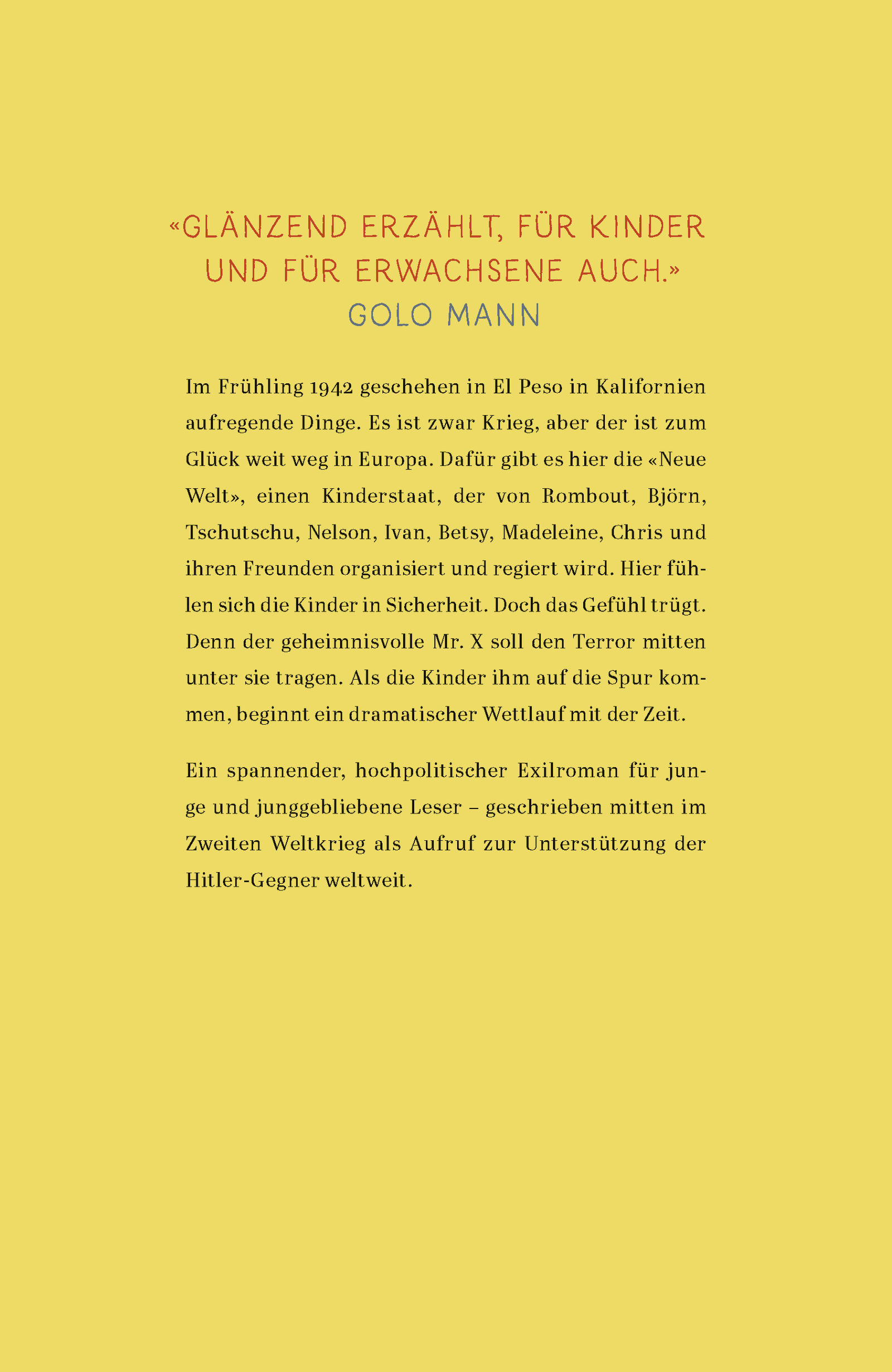 Im Frühling 1942 geschehen in El Peso in Kalifornien aufregende Dinge. Es ist zwar Krieg, aber der ist zum Glück weit weg in Europa. Dafür gibt es hier die »Neue Welt«, einen Kinderstaat, der von Rombout, Björn, Tschutschu, Nelson, Ivan, Betsy, Madeleine, Chris und ihren Freunden organisiert und regiert wird. Hier fühlen sich die Kinder in Sicherheit. Doch das Gefühl trügt. Denn der geheimnisvolle Mr. X soll den Terror mitten unter sie tragen. Als die Kinder ihm auf die Spur kommen, beginnt ein dramatischer Wettlauf mit der Zeit.