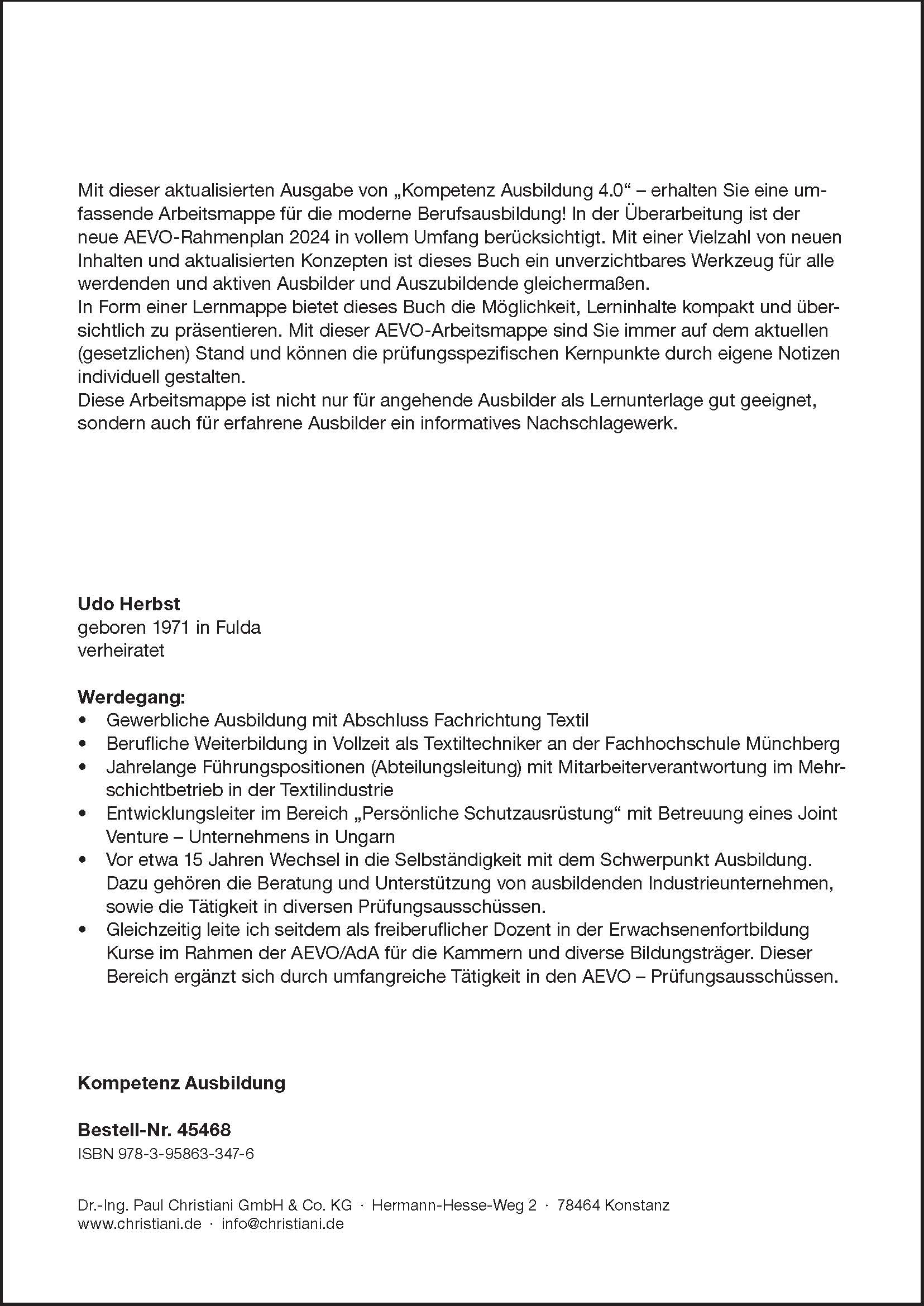 Mit dieser aktualisierten Ausgabe von "Kompetenz Ausbildung" – erhalten Sie eine umfassende Arbeitsmappe für die moderne Berufsausbildung! In der Überarbeitung ist der neue AEVO-Rahmenplan 2024 in vollem Umfang berücksichtigt. Mit einer Vielzahl von neuen Inhalten und aktualisierten Konzepten ist dieses Buch ein unverzichtbares Werkzeug für alle werdenden und aktiven Ausbilder und Auszubildende gleichermaßen.