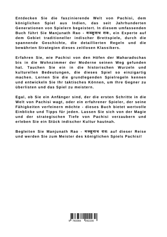 Entdecken Sie die faszinierende Welt von Pachisi, dem königlichen Spiel aus Indien, das seit Jahrhunderten Generationen von Spielern begeistert. In diesem umfassenden Buch führt Sie Manjunath Rao - , ein Experte auf dem Gebiet traditioneller indischer Brettspiele, durch die spannende Geschichte, die detaillierten Regeln und die bewährten Strategien dieses zeitlosen Klassikers.Erfahren Sie, wie Pachisi von den Höfen der Maharadschas bis in die Wohnzimmer der Moderne seinen Weg gefunden hat. Tauchen Sie ein in die historischen Wurzeln und kulturellen Bedeutungen, die dieses Spiel so einzigartig machen. Lernen Sie die grundlegenden Spielregeln kennen und entwickeln Sie Ihr taktisches Können, um Ihre Gegner zu überlisten und das Spiel zu meistern.Egal, ob Sie ein Anfänger sind, der die ersten Schritte in die Welt von Pachisi wagt, oder ein erfahrener Spieler, der seine Fähigkeiten verfeinern möchte - dieses Buch bietet wertvolle Einblicke und Tipps für jeden. Lassen Sie sich von der Magie und der strategischen Tiefe von Pachisi verzaubern und erleben Sie ein Stück indischer Kultur hautnah.Begleiten Sie Manjunath Rao - auf dieser Reise und werden Sie zum Meister des königlichen Spiels Pachisi!