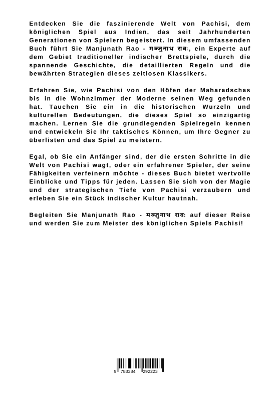 Entdecken Sie die faszinierende Welt von Pachisi, dem königlichen Spiel aus Indien, das seit Jahrhunderten Generationen von Spielern begeistert. In diesem umfassenden Buch führt Sie Manjunath Rao - , ein Experte auf dem Gebiet traditioneller indischer Brettspiele, durch die spannende Geschichte, die detaillierten Regeln und die bewährten Strategien dieses zeitlosen Klassikers.Erfahren Sie, wie Pachisi von den Höfen der Maharadschas bis in die Wohnzimmer der Moderne seinen Weg gefunden hat. Tauchen Sie ein in die historischen Wurzeln und kulturellen Bedeutungen, die dieses Spiel so einzigartig machen. Lernen Sie die grundlegenden Spielregeln kennen und entwickeln Sie Ihr taktisches Können, um Ihre Gegner zu überlisten und das Spiel zu meistern.Egal, ob Sie ein Anfänger sind, der die ersten Schritte in die Welt von Pachisi wagt, oder ein erfahrener Spieler, der seine Fähigkeiten verfeinern möchte - dieses Buch bietet wertvolle Einblicke und Tipps für jeden. Lassen Sie sich von der Magie und der strategischen Tiefe von Pachisi verzaubern und erleben Sie ein Stück indischer Kultur hautnah.Begleiten Sie Manjunath Rao - auf dieser Reise und werden Sie zum Meister des königlichen Spiels Pachisi!