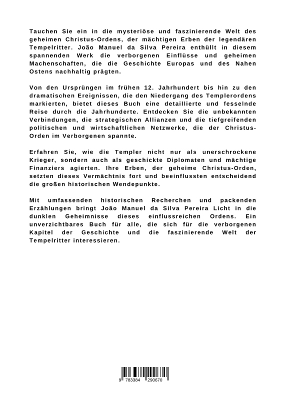 Tauchen Sie ein in die mysteriöse und faszinierende Welt des geheimen Christus-Ordens, der mächtigen Erben der legendären Tempelritter. João Manuel da Silva Pereira enthüllt in diesem spannenden Werk die verborgenen Einflüsse und geheimen Machenschaften, die die Geschichte Europas und des Nahen Ostens nachhaltig prägten.Von den Ursprüngen im frühen 12. Jahrhundert bis hin zu den dramatischen Ereignissen, die den Niedergang des Templerordens markierten, bietet dieses Buch eine detaillierte und fesselnde Reise durch die Jahrhunderte. Entdecken Sie die unbekannten Verbindungen, die strategischen Allianzen und die tiefgreifenden politischen und wirtschaftlichen Netzwerke, die der Christus-Orden im Verborgenen spannte.Erfahren Sie, wie die Templer nicht nur als unerschrockene Krieger, sondern auch als geschickte Diplomaten und mächtige Finanziers agierten. Ihre Erben, der geheime Christus-Orden, setzten dieses Vermächtnis fort und beeinflussten entscheidend die großen historischen Wendepunkte.Mit umfassenden historischen Recherchen und packenden Erzählungen bringt João Manuel da Silva Pereira Licht in die dunklen Geheimnisse dieses einflussreichen Ordens. Ein unverzichtbares Buch für alle, die sich für die verborgenen Kapitel der Geschichte und die faszinierende Welt der Tempelritter interessieren.