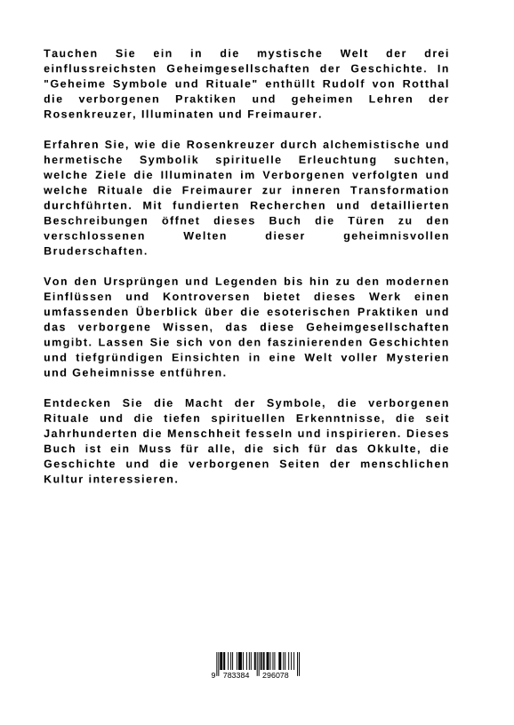 Tauchen Sie ein in die mystische Welt der drei einflussreichsten Geheimgesellschaften der Geschichte. In "Geheime Symbole und Rituale" enthüllt Rudolf von Rotthal die verborgenen Praktiken und geheimen Lehren der Rosenkreuzer, Illuminaten und Freimaurer.Erfahren Sie, wie die Rosenkreuzer durch alchemistische und hermetische Symbolik spirituelle Erleuchtung suchten, welche Ziele die Illuminaten im Verborgenen verfolgten und welche Rituale die Freimaurer zur inneren Transformation durchführten. Mit fundierten Recherchen und detaillierten Beschreibungen öffnet dieses Buch die Türen zu den verschlossenen Welten dieser geheimnisvollen Bruderschaften.Von den Ursprüngen und Legenden bis hin zu den modernen Einflüssen und Kontroversen bietet dieses Werk einen umfassenden Überblick über die esoterischen Praktiken und das verborgene Wissen, das diese Geheimgesellschaften umgibt. Lassen Sie sich von den faszinierenden Geschichten und tiefgründigen Einsichten in eine Welt voller Mysterien und Geheimnisse entführen.Entdecken Sie die Macht der Symbole, die verborgenen Rituale und die tiefen spirituellen Erkenntnisse, die seit Jahrhunderten die Menschheit fesseln und inspirieren. Dieses Buch ist ein Muss für alle, die sich für das Okkulte, die Geschichte und die verborgenen Seiten der menschlichen Kultur interessieren.