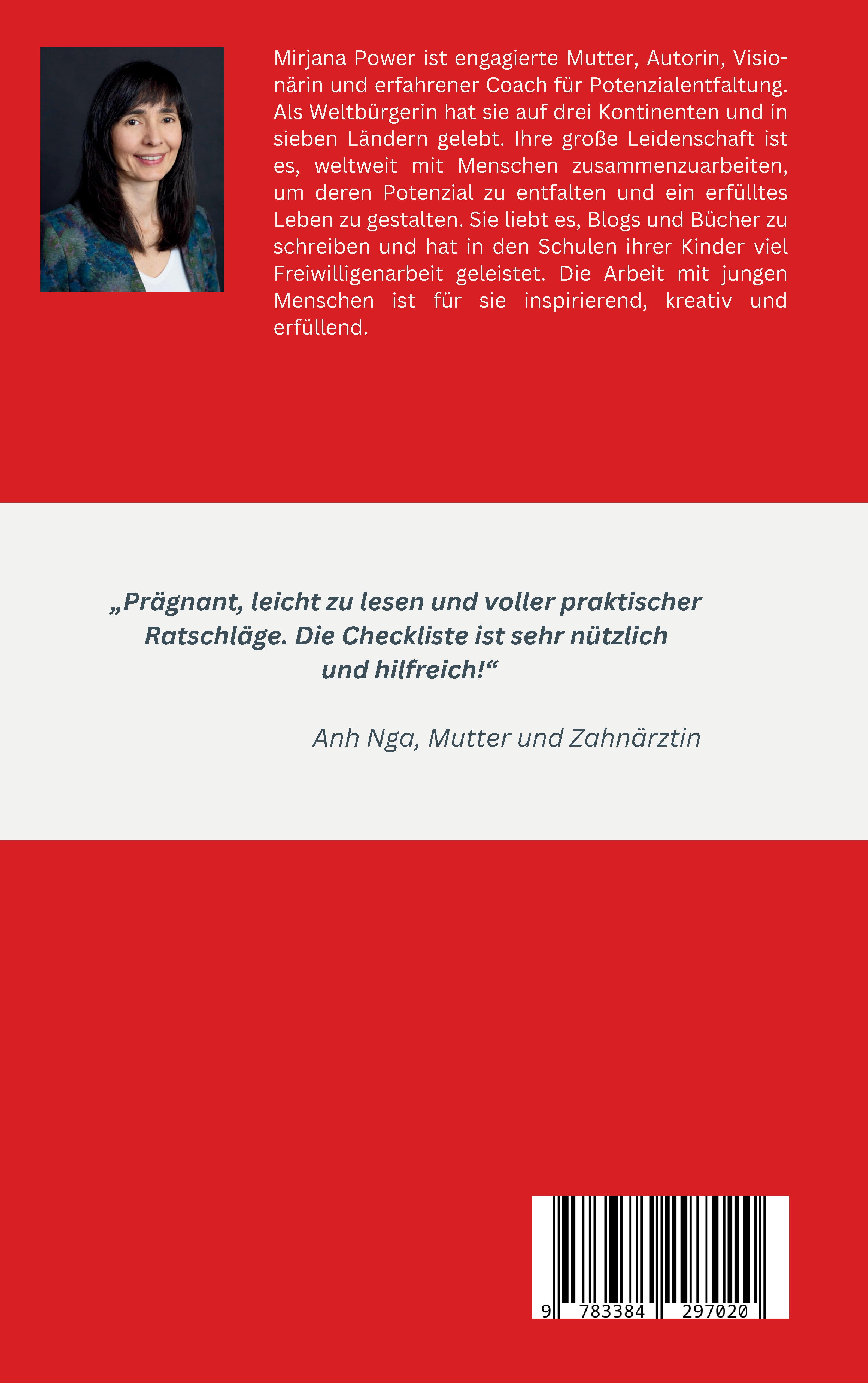 Mirjana Power ist engagierte Mutter, Autorin, Visionärin und erfahrener Coach für Potenzialentfaltung. Als Weltbürgerin hat sie auf drei Kontinenten und in sieben Ländern gelebt. Nach ihrem Dolmetschstudium hat sie im Fondsmanagement gearbeitet. Zahlreiche internationale Aus- und Weiterbildungen umfassen Bereiche wie Coaching, Kunstausdruckstherapie, Achtsamkeit und Tiefenmeditation. Ihre große Leidenschaft ist es, weltweit mit Menschen zusammenzuarbeiten, um deren Potenzial zu entfalten und ein erfülltes Leben zu gestalten. Sie liebt es, Blogs und Bücher zu schreiben und hat in den Schulen ihrer Kinder viel Freiwilligenarbeit geleistet. Die Arbeit mit jungen Menschen ist für sie inspirierend, kreativ und erfüllend. Mirjana Power is a dedicated mother, author, visionary and human potential coach. A global citizen, she has lived on three continents and in seven different countries. Mirjana is passionate about working with people around the world to unlock their full potential and create a fulfilling life. She loves to write blogs and books. As a mother she has done a lot of volunteer work in her children's schools. She finds working with young people inspiring, creative and fulfilling.
