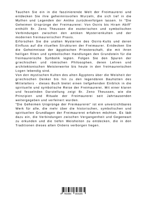 Tauchen Sie ein in die faszinierende Welt der Freimaurerei und entdecken Sie ihre geheimnisvollen Wurzeln, die sich tief in die Mythen und Legenden der Antike zurückverfolgen lassen. In "Die Geheimen Ursprünge der Freimaurerei: Von Osiris bis Hiram Abiff" enthüllt Br. Zeno Theussen die esoterischen und symbolischen Verbindungen zwischen den antiken Mysterienkulten und der modernen freimaurerischen Praxis.Erforschen Sie die uralten Mysterien des Osiris-Kults und deren Einfluss auf die rituellen Strukturen der Freimaurer. Entdecken Sie die Geheimnisse der ägyptischen Priesterschaft, die mit ihren heiligen Riten und symbolischen Handlungen den Grundstein für die freimaurerische Symbolik legten. Folgen Sie den Spuren der griechischen und römischen Philosophen, deren Lehren und architektonischen Meisterwerke bis heute in den freimaurerischen Logen lebendig sind.Von den mystischen Kulten des alten Ägyptens über die Weisheit der griechischen Denker bis hin zu den legendären Bauhütten des Mittelalters - dieses Buch bietet einen tiefgehenden Einblick in die spirituelle und symbolische Reise der Freimaurerei. Mit einer klaren und fesselnden Darstellung zeigt Br. Zeno Theussen, wie die Prinzipien und Rituale der Freimaurerei seit Jahrtausenden weitergegeben und verfeinert wurden."Die Geheimen Ursprünge der Freimaurerei" ist ein unverzichtbares Werk für alle, die mehr über die historischen, symbolischen und spirituellen Grundlagen der Freimaurerei erfahren möchten. Es lädt dazu ein, die Verbindungen zwischen Vergangenheit und Gegenwart zu erkunden und die tiefen Weisheiten zu entdecken, die in den Traditionen dieses alten Ordens verborgen liegen.