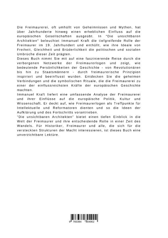Die Freimaurerei, oft umhüllt von Geheimnissen und Mythen, hat über Jahrhunderte hinweg einen erheblichen Einfluss auf die europäischen Gesellschaften ausgeübt. In "Die unsichtbaren Architekten" beleuchtet Immanuel Kraft die tiefgreifende Rolle der Freimaurer im 19. Jahrhundert und enthüllt, wie ihre Ideale von Freiheit, Gleichheit und Brüderlichkeit die politischen und sozialen Umbrüche dieser Zeit prägten.Dieses Buch nimmt Sie mit auf eine faszinierende Reise durch die verborgenen Netzwerke der Freimaurerlogen und zeigt, wie bedeutende Persönlichkeiten der Geschichte - von Revolutionären bis hin zu Staatsmännern - durch freimaurerische Prinzipien inspiriert und beeinflusst wurden. Entdecken Sie die geheimen Verbindungen und die symbolischen Rituale, die die Freimaurerei zu einer der einflussreichsten Kräfte der europäischen Geschichte machten.Immanuel Kraft liefert eine umfassende Analyse der Freimaurerei und ihrer Einflüsse auf die europäische Politik, Kultur und Wissenschaft. Er deckt auf, wie Freimaurerlogen als Treffpunkte für Intellektuelle und Reformatoren dienten und so die Ideen der Aufklärung und des Fortschritts vorantrieben."Die unsichtbaren Architekten" bietet einen tiefen Einblick in die Welt der Freimaurer und ihre entscheidende Rolle in einer Zeit des Wandels. Für Historiker, Freimaurer und alle, die sich für die versteckten Strukturen der Macht interessieren, ist dieses Buch eine unverzichtbare Lektüre.