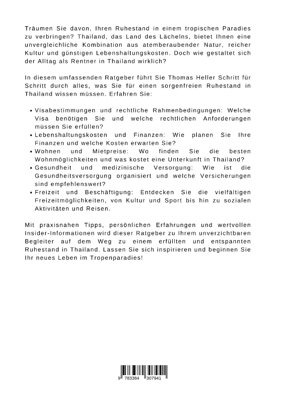 Träumen Sie davon, Ihren Ruhestand in einem tropischen Paradies zu verbringen? Thailand, das Land des Lächelns, bietet Ihnen eine unvergleichliche Kombination aus atemberaubender Natur, reicher Kultur und günstigen Lebenshaltungskosten. Doch wie gestaltet sich der Alltag als Rentner in Thailand wirklich?In diesem umfassenden Ratgeber führt Sie Thomas Heller Schritt für Schritt durch alles, was Sie für einen sorgenfreien Ruhestand in Thailand wissen müssen. Erfahren Sie:Visabestimmungen und rechtliche Rahmenbedingungen: Welche Visa benötigen Sie und welche rechtlichen Anforderungen müssen Sie erfüllen?Lebenshaltungskosten und Finanzen: Wie planen Sie Ihre Finanzen und welche Kosten erwarten Sie?Wohnen und Mietpreise: Wo finden Sie die besten Wohnmöglichkeiten und was kostet eine Unterkunft in Thailand?Gesundheit und medizinische Versorgung: Wie ist die Gesundheitsversorgung organisiert und welche Versicherungen sind empfehlenswert?Freizeit und Beschäftigung: Entdecken Sie die vielfältigen Freizeitmöglichkeiten, von Kultur und Sport bis hin zu sozialen Aktivitäten und Reisen.Mit praxisnahen Tipps, persönlichen Erfahrungen und wertvollen Insider-Informationen wird dieser Ratgeber zu Ihrem unverzichtbaren Begleiter auf dem Weg zu einem erfüllten und entspannten Ruhestand in Thailand. Lassen Sie sich inspirieren und beginnen Sie Ihr neues Leben im Tropenparadies!
