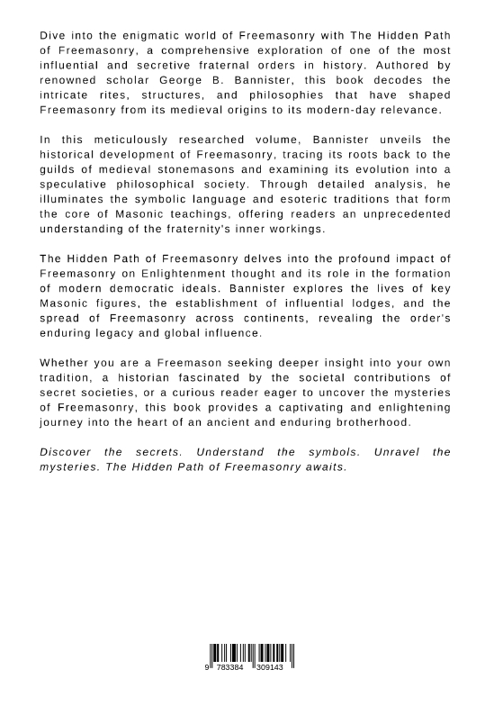 Dive into the enigmatic world of Freemasonry with The Hidden Path of Freemasonry, a comprehensive exploration of one of the most influential and secretive fraternal orders in history. Authored by renowned scholar George B. Bannister, this book decodes the intricate rites, structures, and philosophies that have shaped Freemasonry from its medieval origins to its modern-day relevance.In this meticulously researched volume, Bannister unveils the historical development of Freemasonry, tracing its roots back to the guilds of medieval stonemasons and examining its evolution into a speculative philosophical society. Through detailed analysis, he illuminates the symbolic language and esoteric traditions that form the core of Masonic teachings, offering readers an unprecedented understanding of the fraternity's inner workings.The Hidden Path of Freemasonry delves into the profound impact of Freemasonry on Enlightenment thought and its role in the formation of modern democratic ideals. Bannister explores the lives of key Masonic figures, the establishment of influential lodges, and the spread of Freemasonry across continents, revealing the order's enduring legacy and global influence.Whether you are a Freemason seeking deeper insight into your own tradition, a historian fascinated by the societal contributions of secret societies, or a curious reader eager to uncover the mysteries of Freemasonry, this book provides a captivating and enlightening journey into the heart of an ancient and enduring brotherhood.Discover the secrets. Understand the symbols. Unravel the mysteries. The Hidden Path of Freemasonry awaits.