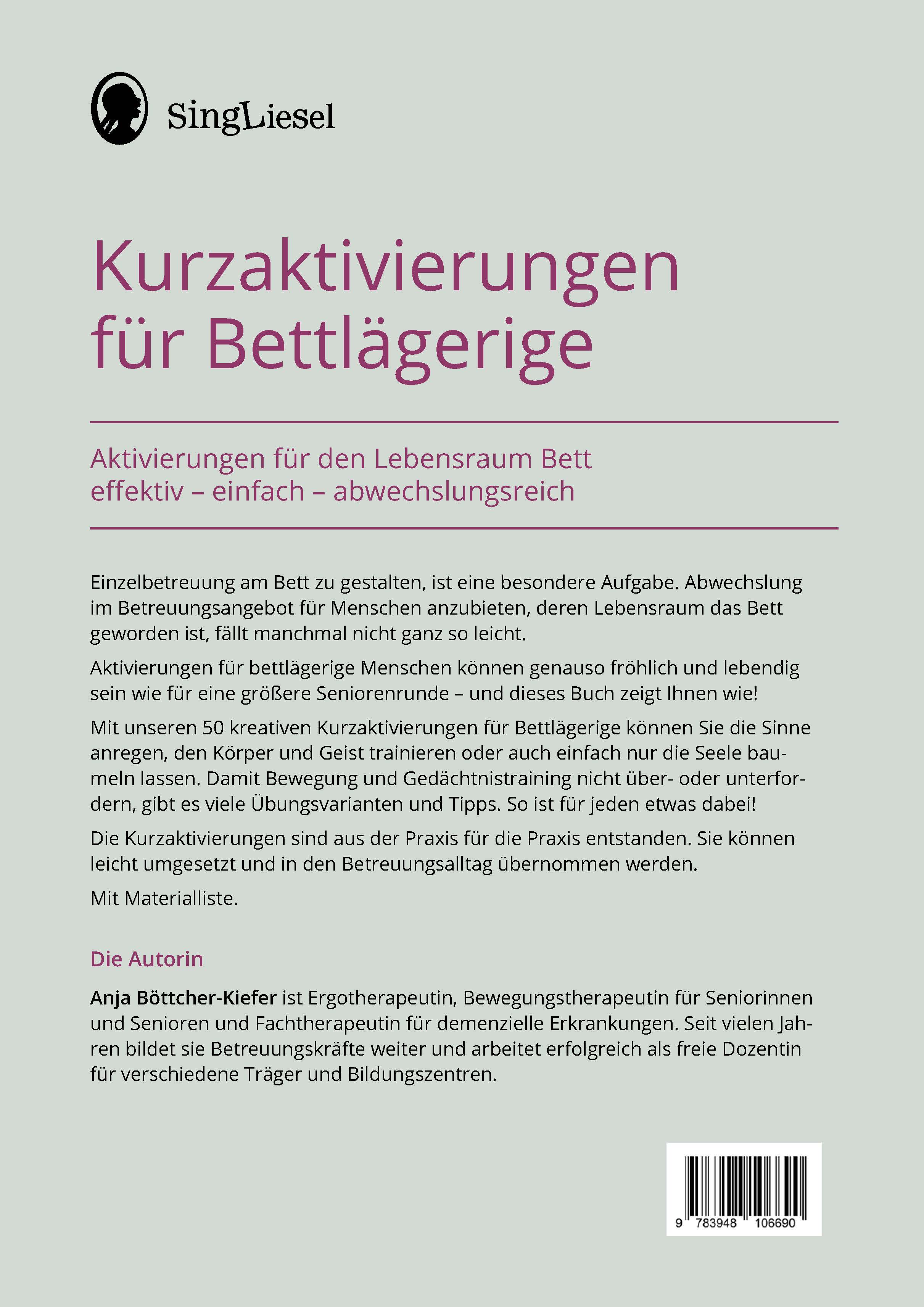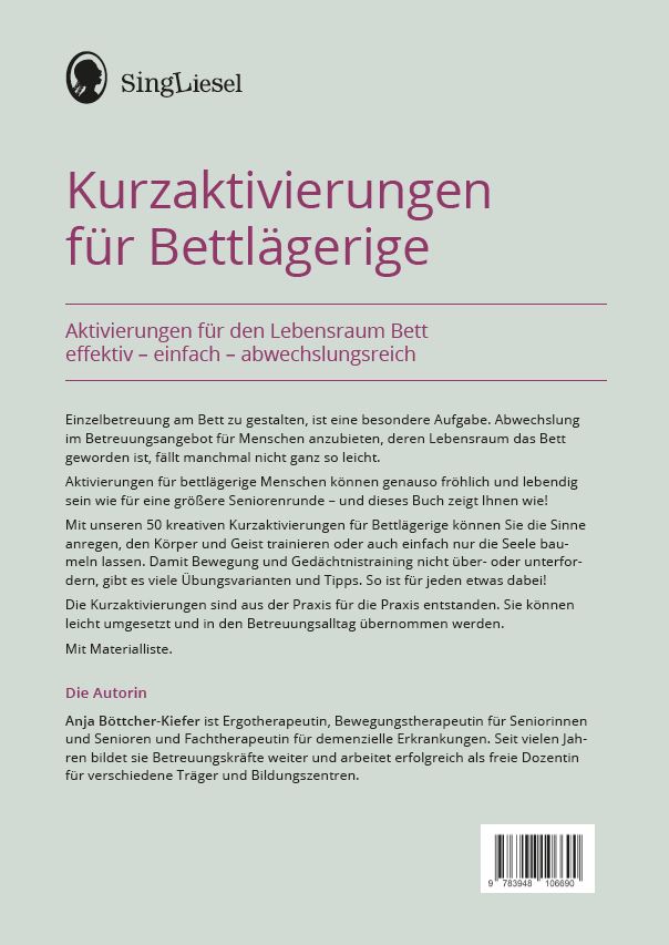 Mit unseren 50 kreativen Kurzaktivierungen für Bettlägerige können Sie die Sinne anregen, den Körper und Geist trainieren oder auch einfach nur die Seele baumeln lassen. Damit Bewegung und Gedächtnistraining nicht über- oder unterfordern, gibt es viele Übungsvarianten und Tipps. So ist für jeden etwas dabei!