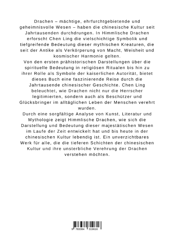 Drachen - mächtige, ehrfurchtgebietende und geheimnisvolle Wesen - haben die chinesische Kultur seit Jahrtausenden durchdrungen. In Himmlische Drachen erforscht Chen Ling die vielschichtige Symbolik und tiefgreifende Bedeutung dieser mythischen Kreaturen, die seit der Antike als Verkörperung von Macht, Weisheit und kosmischer Harmonie gelten.Von den ersten prähistorischen Darstellungen über die spirituelle Bedeutung in religiösen Ritualen bis hin zu ihrer Rolle als Symbole der kaiserlichen Autorität, bietet dieses Buch eine faszinierende Reise durch die Jahrtausende chinesischer Geschichte. Chen Ling beleuchtet, wie Drachen nicht nur die Herrscher legitimierten, sondern auch als Beschützer und Glücksbringer im alltäglichen Leben der Menschen verehrt wurden.Durch eine sorgfältige Analyse von Kunst, Literatur und Mythologie zeigt Himmlische Drachen, wie sich die Darstellung und Bedeutung dieser majestätischen Wesen im Laufe der Zeit entwickelt hat und bis heute in der chinesischen Kultur lebendig ist. Ein unverzichtbares Werk für alle, die die tieferen Schichten der chinesischen Kultur und ihre unsterbliche Verehrung der Drachen verstehen möchten.