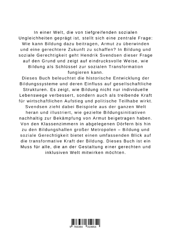 In einer Welt, die von tiefgreifenden sozialen Ungleichheiten geprägt ist, stellt sich eine zentrale Frage: Wie kann Bildung dazu beitragen, Armut zu überwinden und eine gerechtere Zukunft zu schaffen? In Bildung und soziale Gerechtigkeit geht Hendrik Svendsen dieser Frage auf den Grund und zeigt auf eindrucksvolle Weise, wie Bildung als Schlüssel zur sozialen Transformation fungieren kann.Dieses Buch beleuchtet die historische Entwicklung der Bildungssysteme und deren Einfluss auf gesellschaftliche Strukturen. Es zeigt, wie Bildung nicht nur individuelle Lebenswege verbessert, sondern auch als treibende Kraft für wirtschaftlichen Aufstieg und politische Teilhabe wirkt. Svendsen zieht dabei Beispiele aus der ganzen Welt heran und illustriert, wie gezielte Bildungsinitiativen nachhaltig zur Bekämpfung von Armut beigetragen haben.Von den Klassenzimmern in abgelegenen Dörfern bis hin zu den Bildungshallen großer Metropolen - Bildung und soziale Gerechtigkeit bietet einen umfassenden Blick auf die transformative Kraft der Bildung. Dieses Buch ist ein Muss für alle, die an der Gestaltung einer gerechten und inklusiven Welt mitwirken möchten.