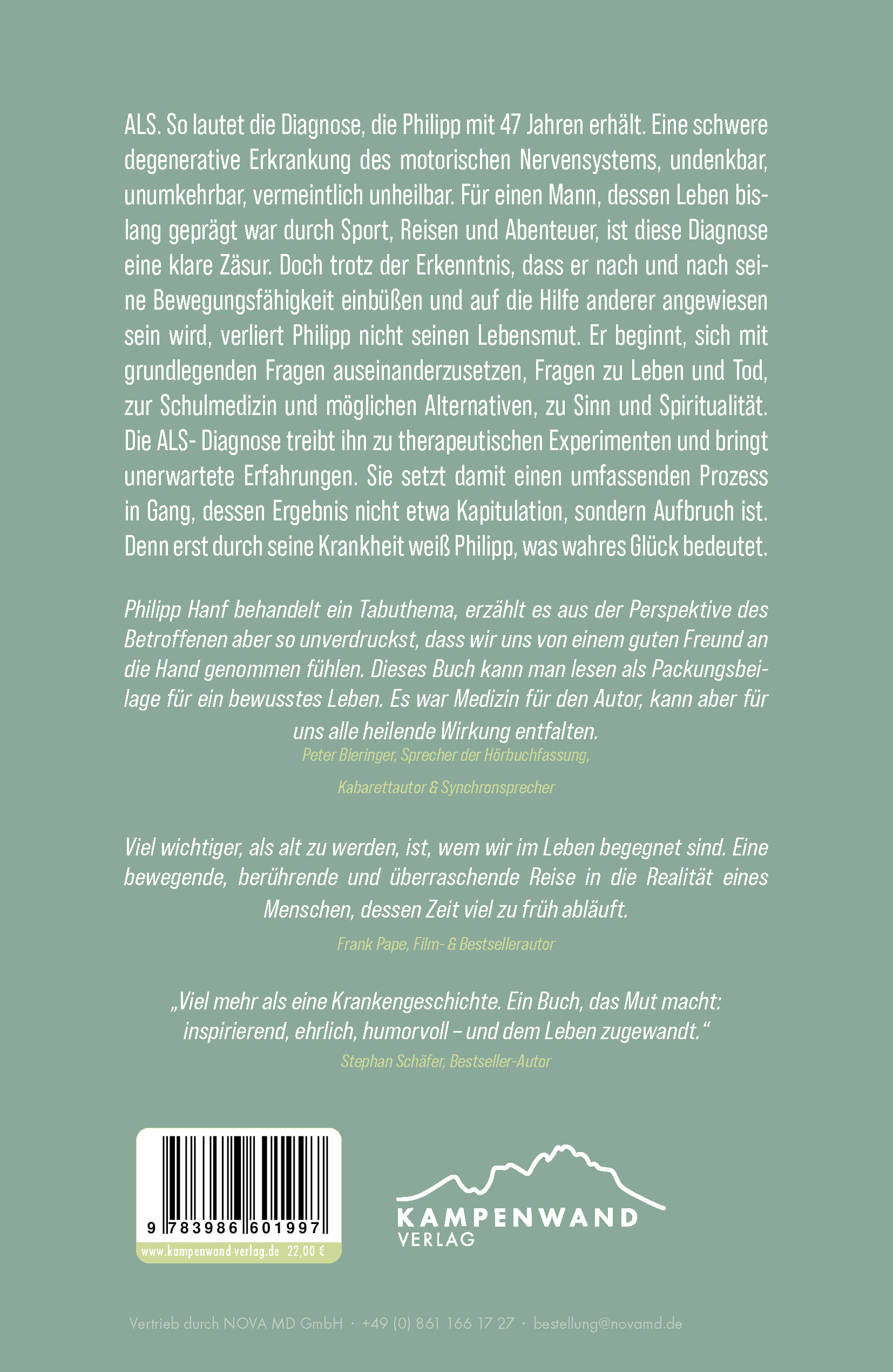 Eine schwere degenerative Erkrankung des motorischen Nervensystems, undenkbar, unumkehrbar, vermeintlich unheilbar. Für einen Mann, dessen Leben bislang geprägt war durch Sport, Reisen und Abenteuer, ist diese Diagnose eine klare Zäsur. Doch trotz der Erkenntnis, dass er nach und nach seine Bewegungsfähigkeit einbüßen und auf die Hilfe anderer angewiesen sein wird, verliert Philipp nicht seinen Lebensmut. Er beginnt, sich mit grundlegenden Fragen auseinanderzusetzen, Fragen zu Leben und Tod, zur Schulmedizin und möglichen Alternativen, zu Sinn und Spiritualität.