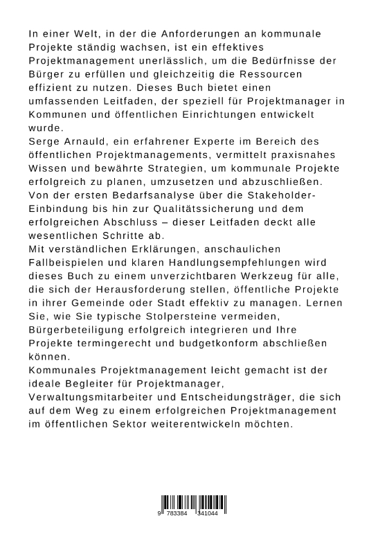 In einer Welt, in der die Anforderungen an kommunale Projekte ständig wachsen, ist ein effektives Projektmanagement unerlässlich, um die Bedürfnisse der Bürger zu erfüllen und gleichzeitig die Ressourcen effizient zu nutzen. Dieses Buch bietet einen umfassenden Leitfaden, der speziell für Projektmanager in Kommunen und öffentlichen Einrichtungen entwickelt wurde.Serge Arnauld, ein erfahrener Experte im Bereich des öffentlichen Projektmanagements, vermittelt praxisnahes Wissen und bewährte Strategien, um kommunale Projekte erfolgreich zu planen, umzusetzen und abzuschließen. Von der ersten Bedarfsanalyse über die Stakeholder-Einbindung bis hin zur Qualitätssicherung und dem erfolgreichen Abschluss - dieser Leitfaden deckt alle wesentlichen Schritte ab.Mit verständlichen Erklärungen, anschaulichen Fallbeispielen und klaren Handlungsempfehlungen wird dieses Buch zu einem unverzichtbaren Werkzeug für alle, die sich der Herausforderung stellen, öffentliche Projekte in ihrer Gemeinde oder Stadt effektiv zu managen. Lernen Sie, wie Sie typische Stolpersteine vermeiden, Bürgerbeteiligung erfolgreich integrieren und Ihre Projekte termingerecht und budgetkonform abschließen können.Kommunales Projektmanagement leicht gemacht ist der ideale Begleiter für Projektmanager, Verwaltungsmitarbeiter und Entscheidungsträger, die sich auf dem Weg zu einem erfolgreichen Projektmanagement im öffentlichen Sektor weiterentwickeln möchten.