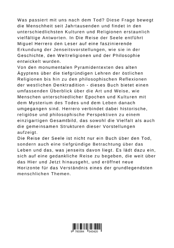 Was passiert mit uns nach dem Tod? Diese Frage bewegt die Menschheit seit Jahrtausenden und findet in den unterschiedlichsten Kulturen und Religionen erstaunlich vielfältige Antworten. In Die Reise der Seele entführt Miguel Herrero den Leser auf eine faszinierende Erkundung der Jenseitsvorstellungen, wie sie in der Geschichte, den Weltreligionen und der Philosophie entwickelt wurden.Von den monumentalen Pyramidentexten des alten Ägyptens über die tiefgründigen Lehren der östlichen Religionen bis hin zu den philosophischen Reflexionen der westlichen Denktradition - dieses Buch bietet einen umfassenden Überblick über die Art und Weise, wie Menschen unterschiedlicher Epochen und Kulturen mit dem Mysterium des Todes und dem Leben danach umgegangen sind. Herrero verbindet dabei historische, religiöse und philosophische Perspektiven zu einem einzigartigen Gesamtbild, das sowohl die Vielfalt als auch die gemeinsamen Strukturen dieser Vorstellungen aufzeigt.Die Reise der Seele ist nicht nur ein Buch über den Tod, sondern auch eine tiefgründige Betrachtung über das Leben und das, was jenseits davon liegt. Es lädt dazu ein, sich auf eine gedankliche Reise zu begeben, die weit über das Hier und Jetzt hinausgeht, und eröffnet neue Horizonte für das Verständnis eines der grundlegendsten menschlichen Themen.