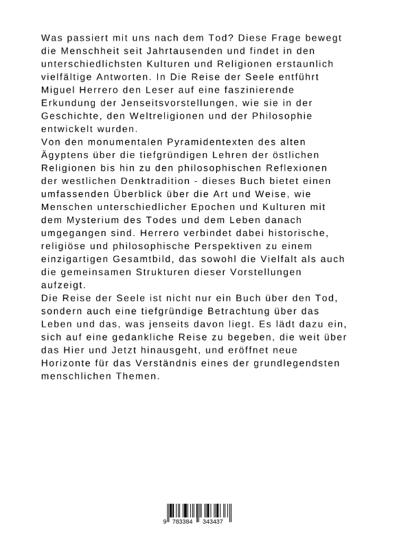 Was passiert mit uns nach dem Tod? Diese Frage bewegt die Menschheit seit Jahrtausenden und findet in den unterschiedlichsten Kulturen und Religionen erstaunlich vielfältige Antworten. In Die Reise der Seele entführt Miguel Herrero den Leser auf eine faszinierende Erkundung der Jenseitsvorstellungen, wie sie in der Geschichte, den Weltreligionen und der Philosophie entwickelt wurden.Von den monumentalen Pyramidentexten des alten Ägyptens über die tiefgründigen Lehren der östlichen Religionen bis hin zu den philosophischen Reflexionen der westlichen Denktradition - dieses Buch bietet einen umfassenden Überblick über die Art und Weise, wie Menschen unterschiedlicher Epochen und Kulturen mit dem Mysterium des Todes und dem Leben danach umgegangen sind. Herrero verbindet dabei historische, religiöse und philosophische Perspektiven zu einem einzigartigen Gesamtbild, das sowohl die Vielfalt als auch die gemeinsamen Strukturen dieser Vorstellungen aufzeigt.Die Reise der Seele ist nicht nur ein Buch über den Tod, sondern auch eine tiefgründige Betrachtung über das Leben und das, was jenseits davon liegt. Es lädt dazu ein, sich auf eine gedankliche Reise zu begeben, die weit über das Hier und Jetzt hinausgeht, und eröffnet neue Horizonte für das Verständnis eines der grundlegendsten menschlichen Themen.