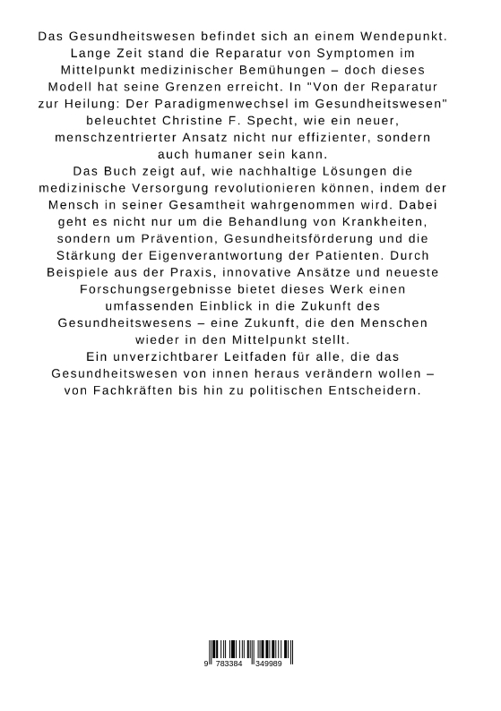 Das Gesundheitswesen befindet sich an einem Wendepunkt. Lange Zeit stand die Reparatur von Symptomen im Mittelpunkt medizinischer Bemühungen - doch dieses Modell hat seine Grenzen erreicht. In "Von der Reparatur zur Heilung: Der Paradigmenwechsel im Gesundheitswesen" beleuchtet Christine F. Specht, wie ein neuer, menschzentrierter Ansatz nicht nur effizienter, sondern auch humaner sein kann.Das Buch zeigt auf, wie nachhaltige Lösungen die medizinische Versorgung revolutionieren können, indem der Mensch in seiner Gesamtheit wahrgenommen wird. Dabei geht es nicht nur um die Behandlung von Krankheiten, sondern um Prävention, Gesundheitsförderung und die Stärkung der Eigenverantwortung der Patienten. Durch Beispiele aus der Praxis, innovative Ansätze und neueste Forschungsergebnisse bietet dieses Werk einen umfassenden Einblick in die Zukunft des Gesundheitswesens - eine Zukunft, die den Menschen wieder in den Mittelpunkt stellt.Ein unverzichtbarer Leitfaden für alle, die das Gesundheitswesen von innen heraus verändern wollen - von Fachkräften bis hin zu politischen Entscheidern.