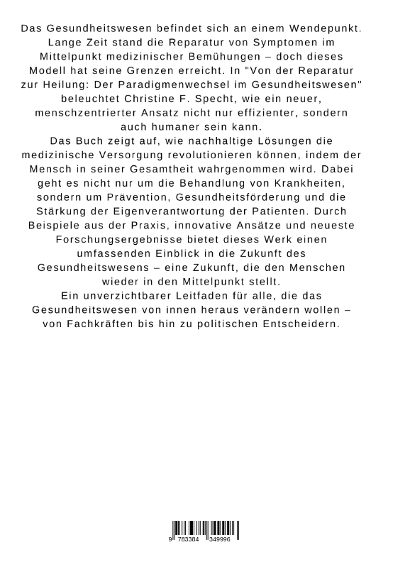 Das Gesundheitswesen befindet sich an einem Wendepunkt. Lange Zeit stand die Reparatur von Symptomen im Mittelpunkt medizinischer Bemühungen - doch dieses Modell hat seine Grenzen erreicht. In "Von der Reparatur zur Heilung: Der Paradigmenwechsel im Gesundheitswesen" beleuchtet Christine F. Specht, wie ein neuer, menschzentrierter Ansatz nicht nur effizienter, sondern auch humaner sein kann.Das Buch zeigt auf, wie nachhaltige Lösungen die medizinische Versorgung revolutionieren können, indem der Mensch in seiner Gesamtheit wahrgenommen wird. Dabei geht es nicht nur um die Behandlung von Krankheiten, sondern um Prävention, Gesundheitsförderung und die Stärkung der Eigenverantwortung der Patienten. Durch Beispiele aus der Praxis, innovative Ansätze und neueste Forschungsergebnisse bietet dieses Werk einen umfassenden Einblick in die Zukunft des Gesundheitswesens - eine Zukunft, die den Menschen wieder in den Mittelpunkt stellt.Ein unverzichtbarer Leitfaden für alle, die das Gesundheitswesen von innen heraus verändern wollen - von Fachkräften bis hin zu politischen Entscheidern.