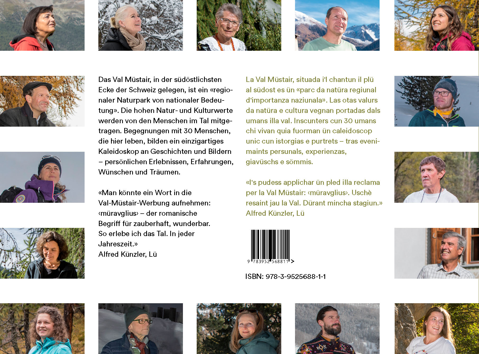 "Man könnte ein Wort in die Val-Müstair-Werbung aufnehmen: "müravglius" - der romanische Begriff für zauberhaft, wunderbar. So erlebe ich das Tal. In jeder Jahreszeit." Alfred Künzler, Lü La Val Müstair, situada i'l chantun il plü al südost es ün «parc da natüra regiunal d'importanza naziunala». Las otas valurs da natüra e cultura vegnan portadas dals umans illa val. Inscunters cun 30 umans chi vivan quia fuorman ün caleidoscop unic cun istorgias e purtrets – tras evenimaints persunals, experienzas, giavüschs e sömmis.